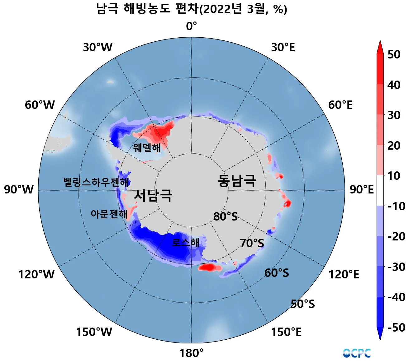 공간적으로는 남극반도를 둘러싼 웨델해 외해역, 벨링스하우젠해 동부, 그리고 아문젠해 서부~로스해의 서남극 연안 해역에서 해빙면적 감소가 두드러졌습니다.