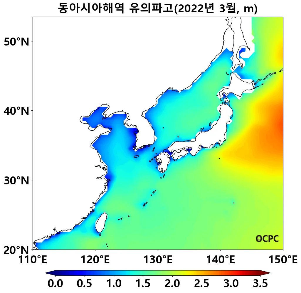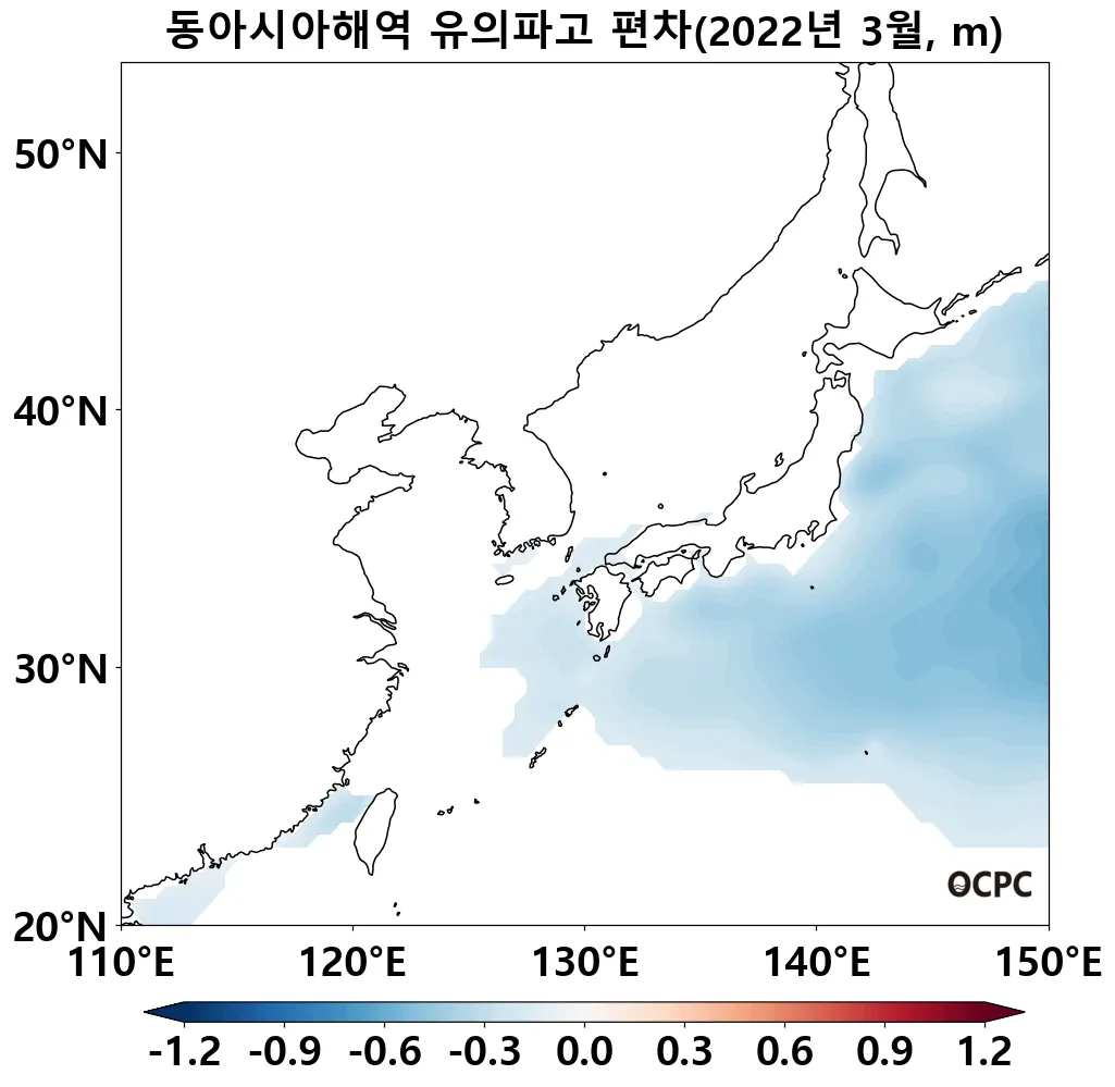 동아시아해역의 평균 유의파고는 평년(2.0m)보다 0.3m 낮았으며, 지난 30년(3월) 중 가장 낮았습니다.