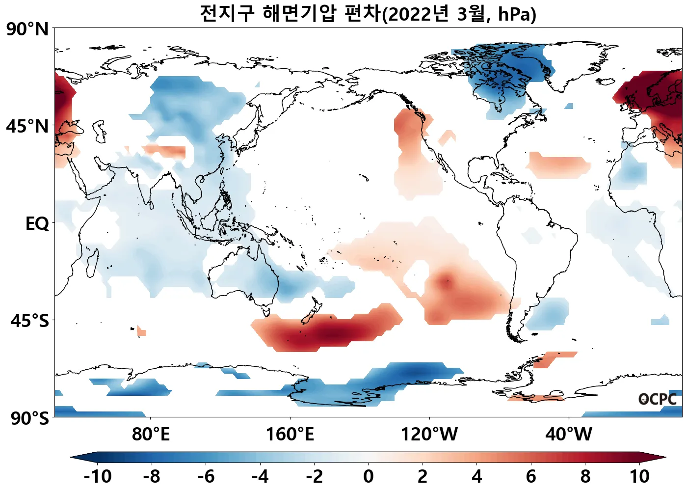 북동태평양 중위도(140°E~180°, 40°N~55°N), 남태평양 중위도(140°E~140°W, 60°S~40°S), 남동태평양 중위도(120°W~80°W, 50°S~20°S) 해역의 해면기압은 평년보다 높았습니다.
