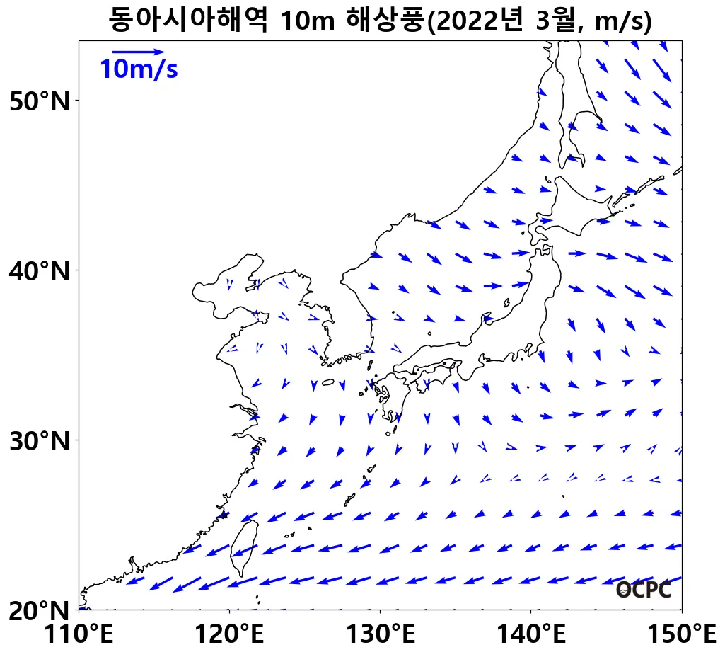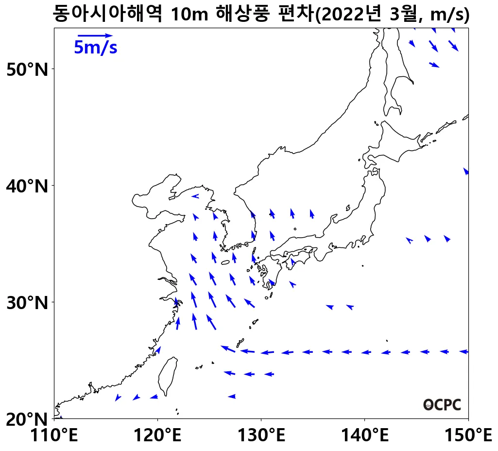 동아시아해역의 해상풍속은 평년(3.2m/s)과 비슷했으나, 동해, 황해, 동중국해를 중심으로 평년보다 북풍이 약했습니다.