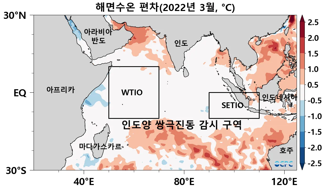 2022년 3월 평균 해면수온의 평년 대비 편차 (숫자가 표시된 사각형은 인도양 쌍극진동 감시구역으로 각각 WTIO(열대서인도양), SETIO(열대 남동인도양) 해역이며, DMI 지수는 WTIO의 평년 대비 편차에서 SETIO의 평년 대비 편차를 뺀 값임)