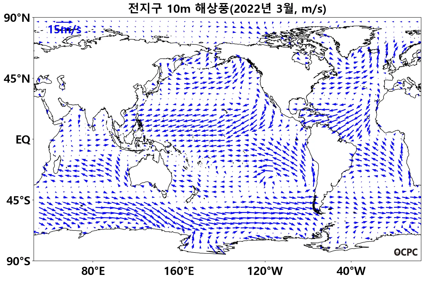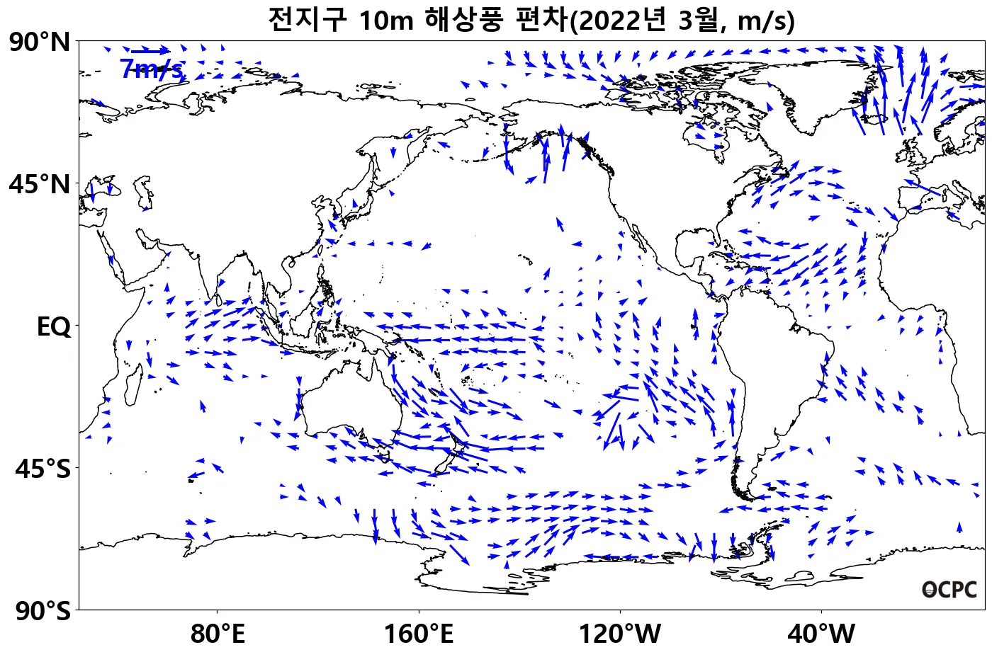 최근 30년 동안 전지구 평균 3월 해상풍속은 10년에 0.1m/s씩 증가하는 추세이며, 동해, 황해, 동중국해는 10년에 0.2m/s씩 감소하는 추세입니다.