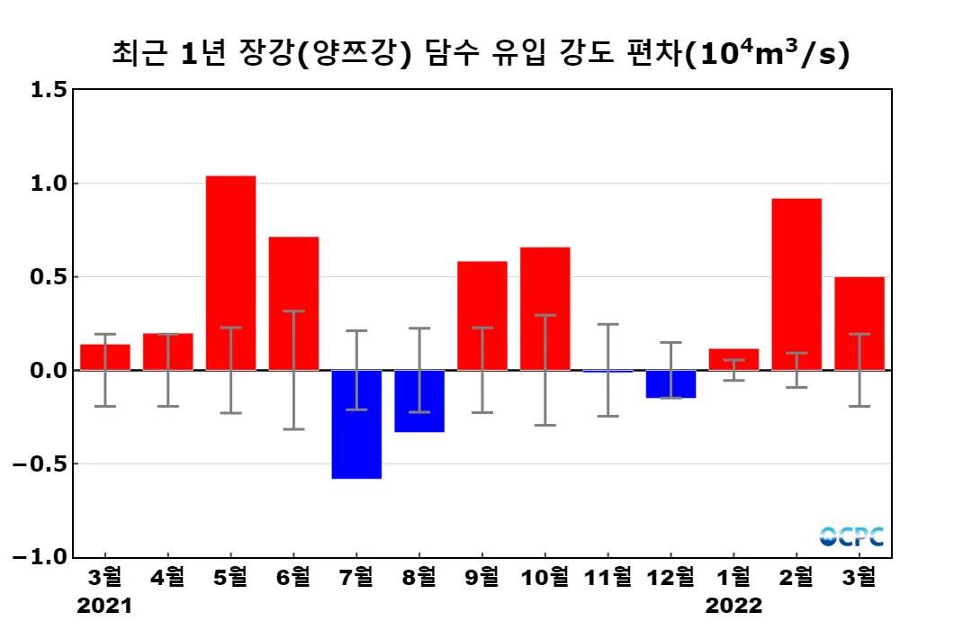 장강(양쯔강)으로부터의 3월 담수 유입 강도는 초당 23,372톤으로 평년 평균(초당 18,370.2톤)보다 27.2% 증가했습니다.