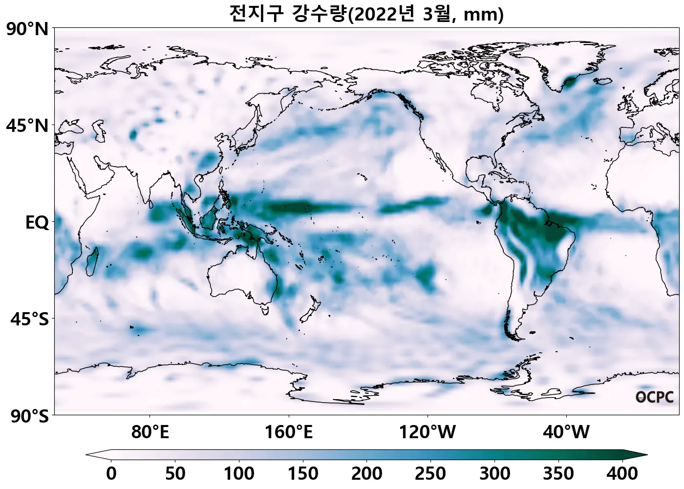 태평양 열대수렴대(Intertropical Convergence Zone, ITCZ) 해역과 열대 대서양(50°W~10°W, 5°S~5°N)의 해상강수량은 평년보다 많았으며, 남태평양수렴대(South Pacific Convergence Zone, SPCZ) 해역은 평년보다 적었습니다.