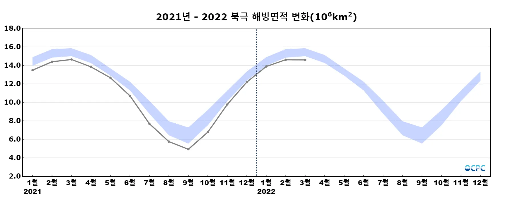 이는 최소 면적을 기록한 2017년보다는 30만km² 늘어난 값이며, 위성관측 기간 중 9번째로 작은 값입니다.