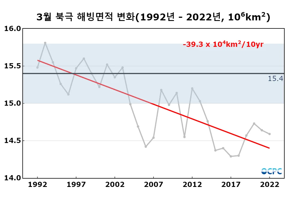 최근 30년 동안 3월 북극 해빙면적의 경향은 10년에 39.3만km² 정도의 감소 추세에 있습니다.