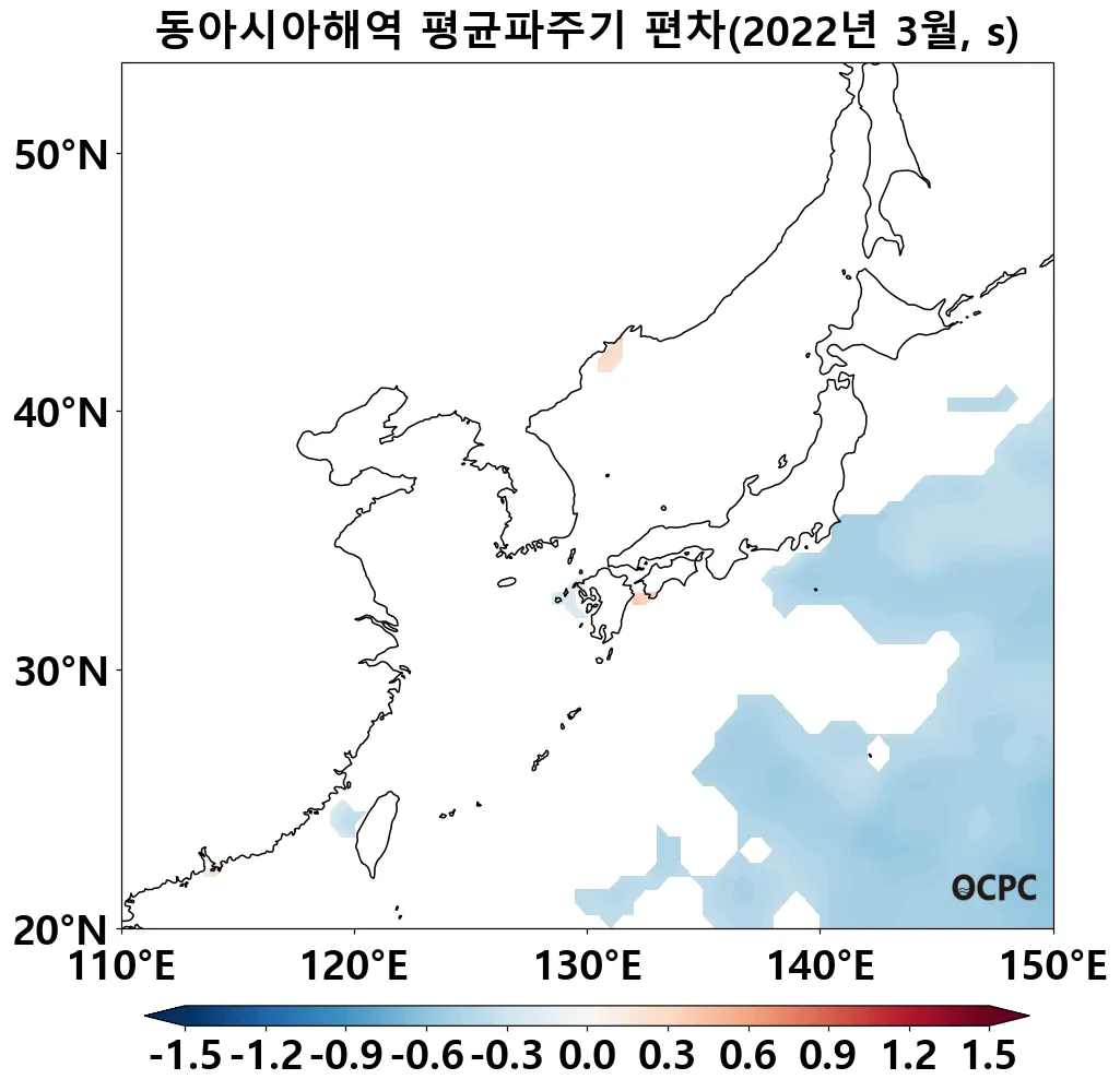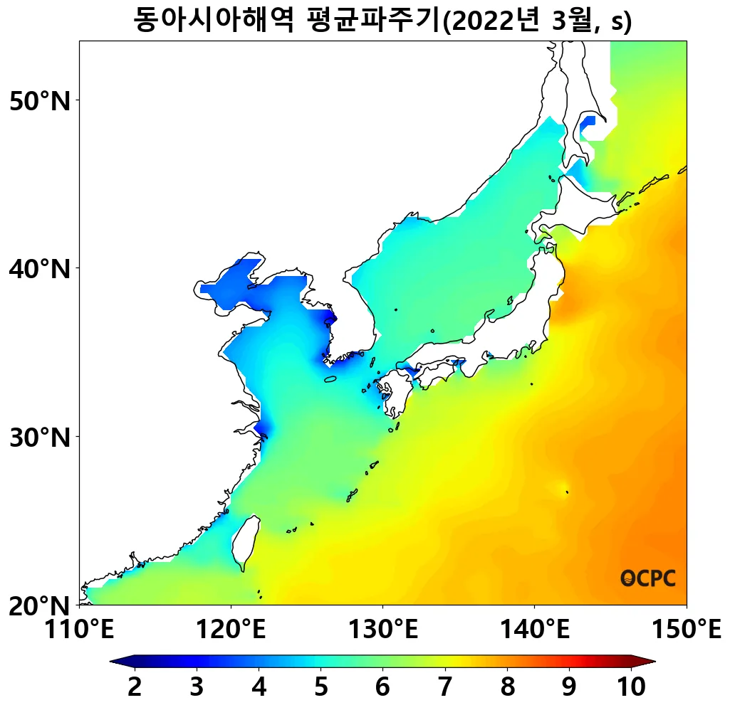 동해, 황해 및 동중국해의 평균파주기는 평년(5.4초, 4.3초, 5.7초)과 비슷했습니다.