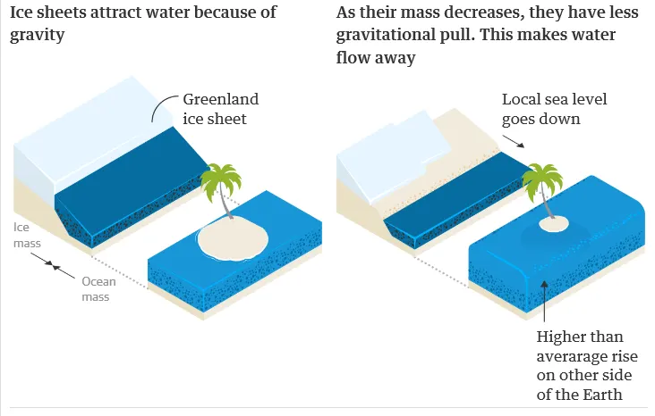 지구보다는 작지만 막대한 하중을 갖을 정도로 거대한 빙상은 주변의 물체를 당기는 중력을 갖고 있습니다. 양극지방의 빙상은 엄청난 양의 바닷물을 극지방 쪽으로 끌어 당겨놓은 상태입니다.