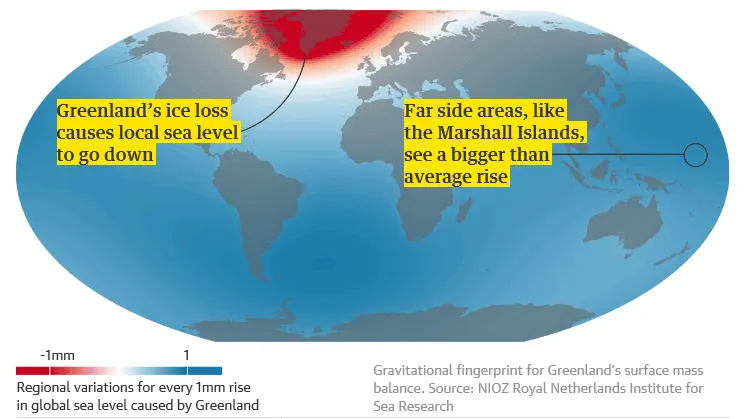 북극 빙상이 녹는 원인을 제공한 북반구 선진국들의 해수면은 오히려 내려가기까지도 하고 피해는 남반구 개도국들에 집중되는 이 아이러니의 원인인 중력장 왜곡현상은 해수면 뿐만 아니라 해류의 흐름, 지구의 자전, 수온과 염분까지도 변화시킬텐데 이러한 요인들은 미래 해수면 전망에 반영되어있지 않습니다.