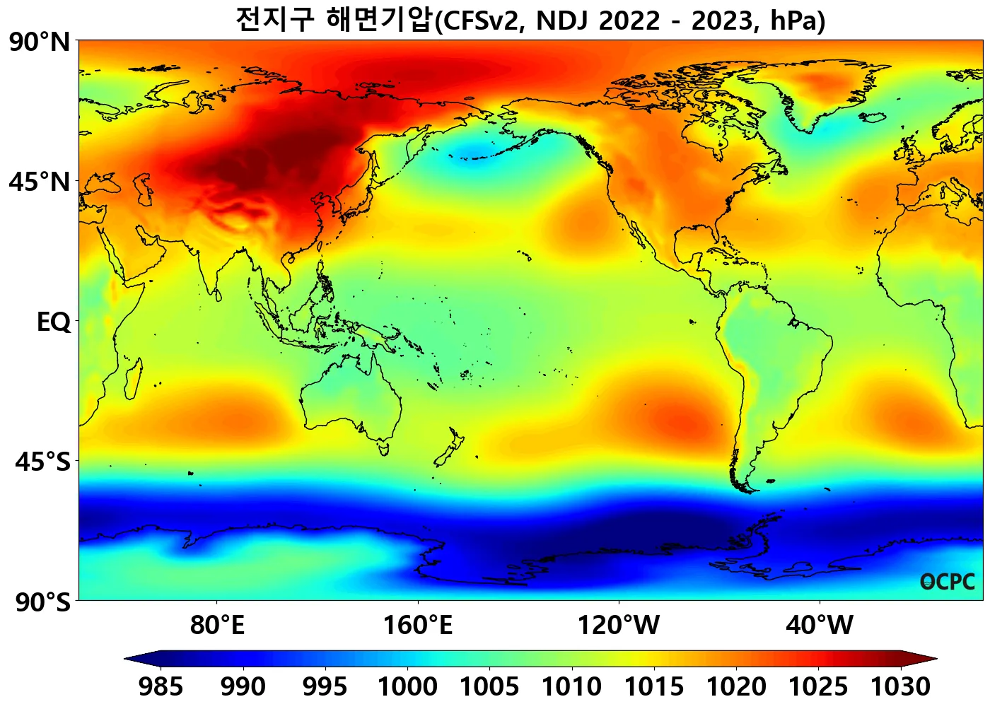 A. 전지구 해면기압 전망(2022년 11월~2023년 1월 평균)
