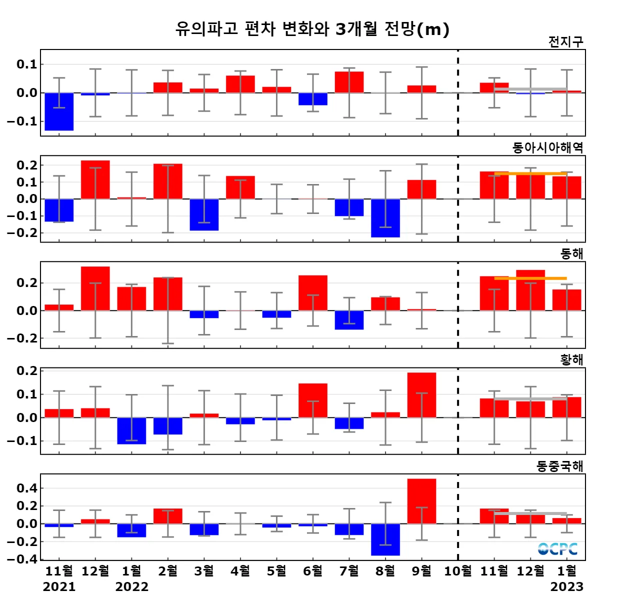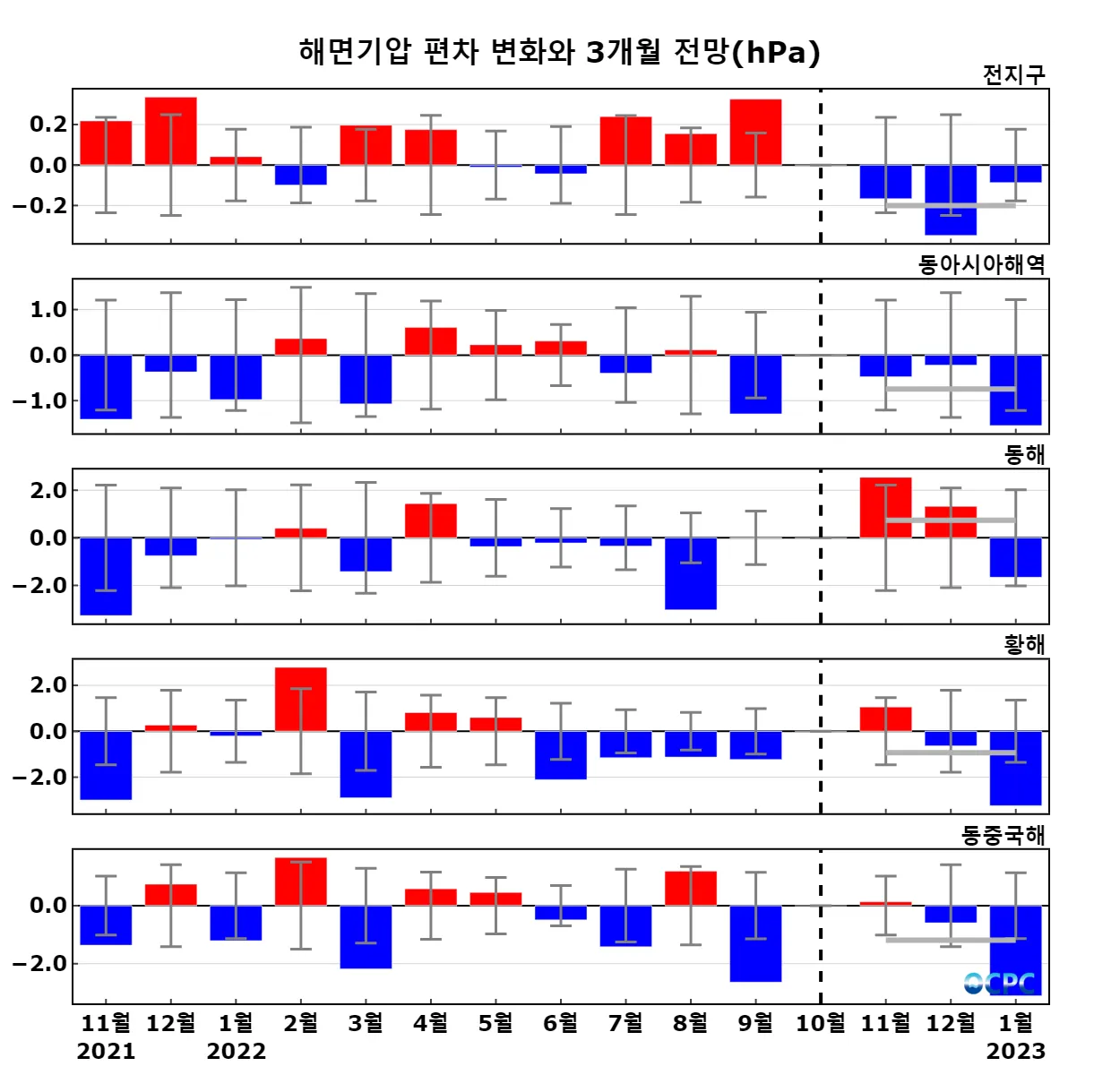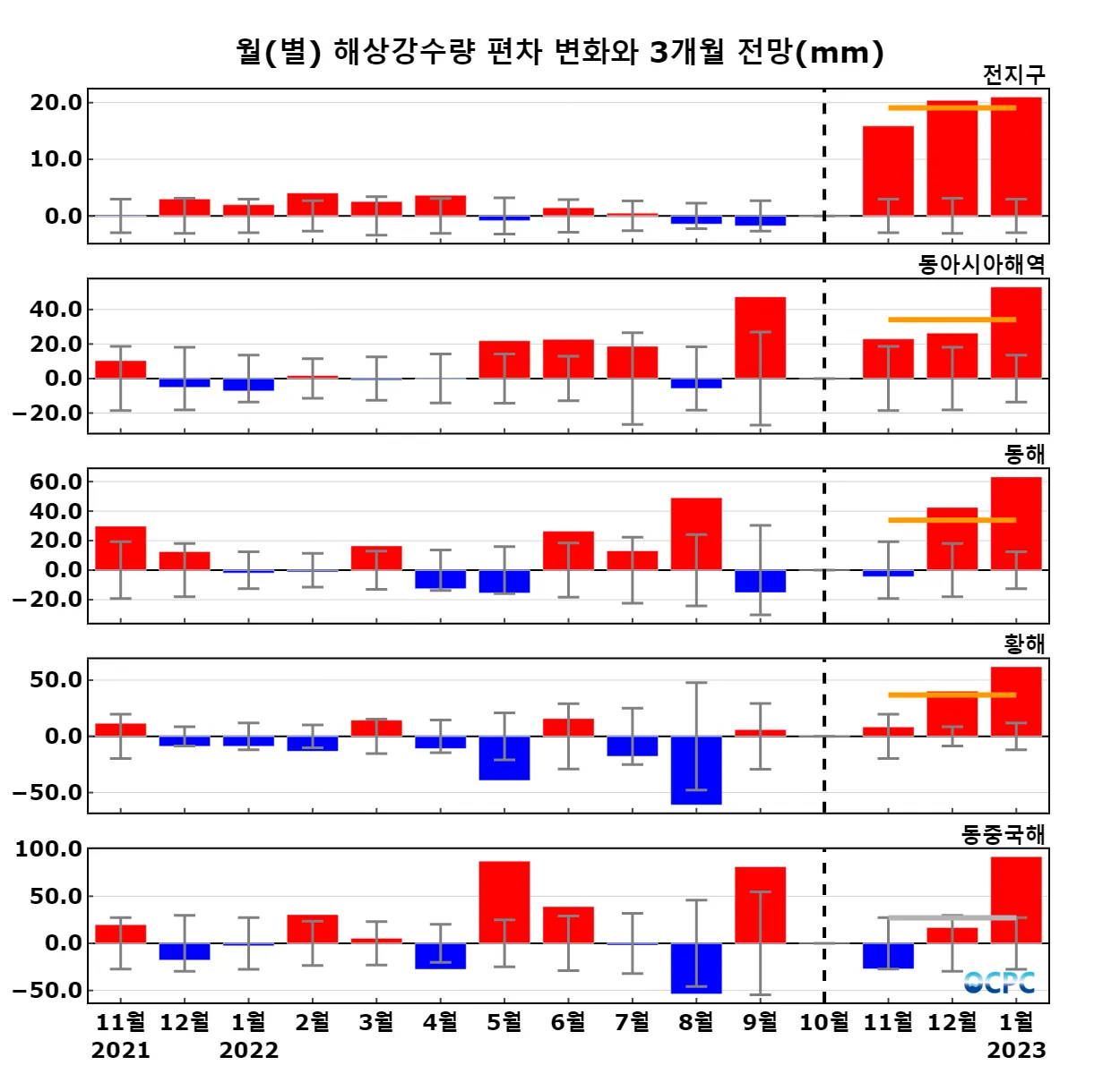 구간표시선: 평년평균±표준편차, 가로실선: 3개월 평균 편차 전망 (주황색: 높음, 회색: 비슷함, 하늘색: 낮음)