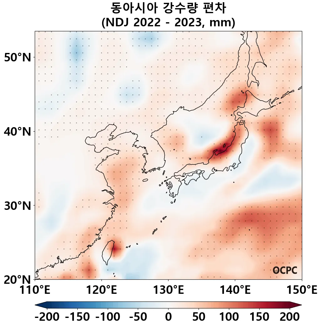 A-B. 동아시아 강수량 편차 전망(2022년 11월~2023년 1월 평균, 점표시: 평년 표준편차 초과 해역)