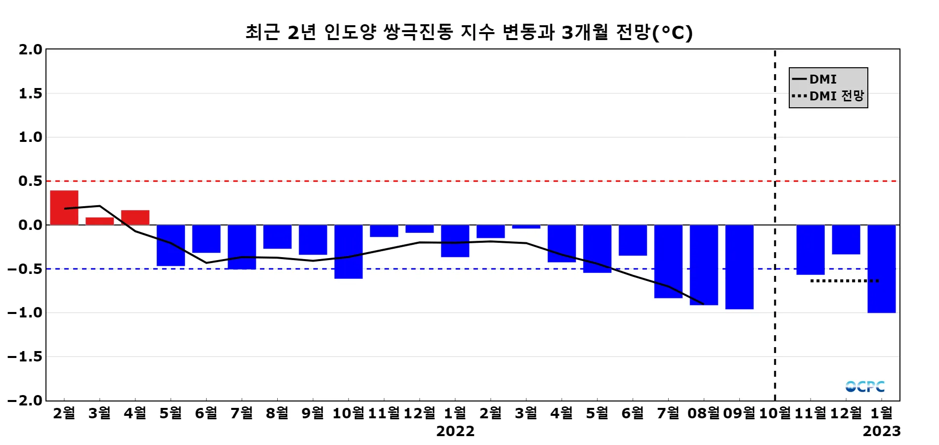 인도양 쌍극진동 지수 DMI (Dipole Mode Index)는 WTIO 해역의 평년 대비 편차에서 SETIO 해역의 평년 대비 편차를 뺀 값으로 월평균 해면수온 편차(채색부분)를 3개월 이동평균하여 나타낸 지수(검정색 실선)로 0.5보다 크면 양의 상태, -0.5보다 작으면 음의 상태로 판정합니다. 과거 지수(최근 2년)는 OISSTv2.1, 전망은 CFSv2 자료에서 산출하였으며, 검정색 점선은 3개월 전망값의 평균값을 나타냅니다.