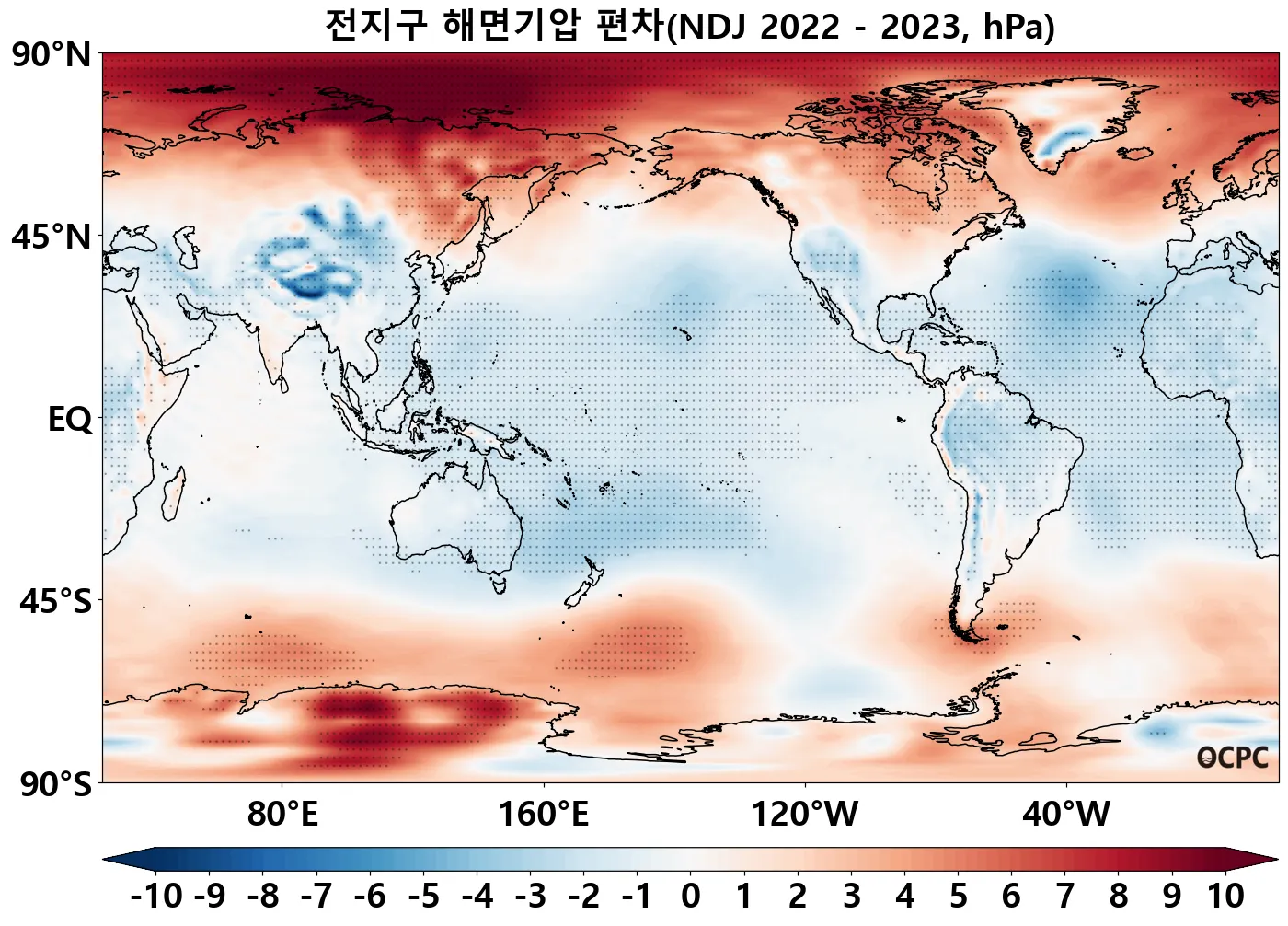 A-B. 전지구 해면기압 편차 전망(2022년 11월~2023년 1월 평균, 점표시: 평년 표준편차 초과 해역)