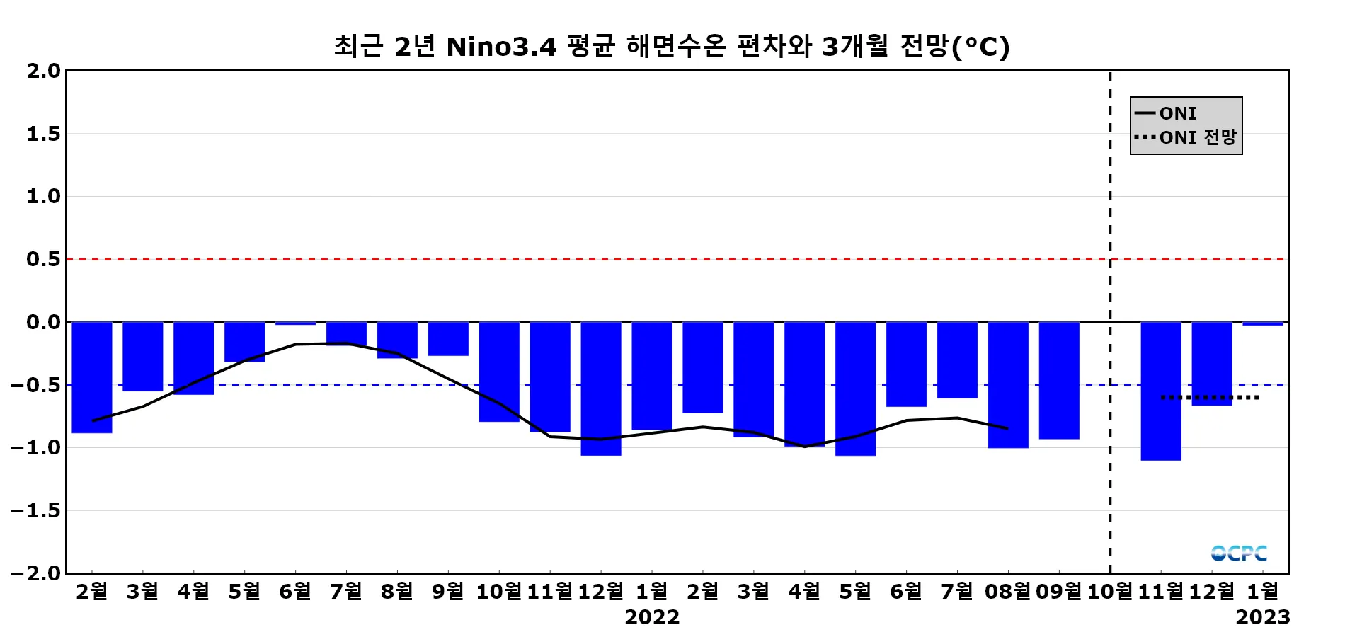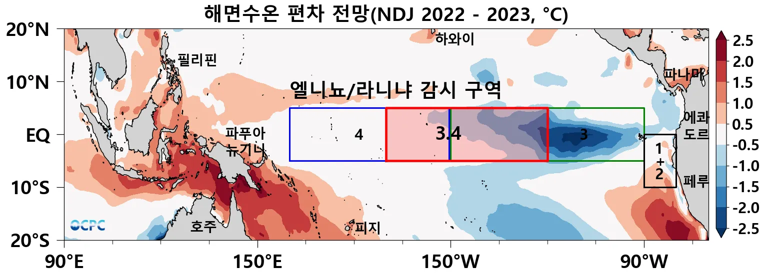 엘니뇨/라니냐 감시구역인 Nino3.4 해역(5°S~5°N, 170°W~120°W)의 2022년 11월 ~ 2023년 1월(NDJ) 해면수온 편차는 라니냐 상태가 지속될 것으로 전망됩니다.