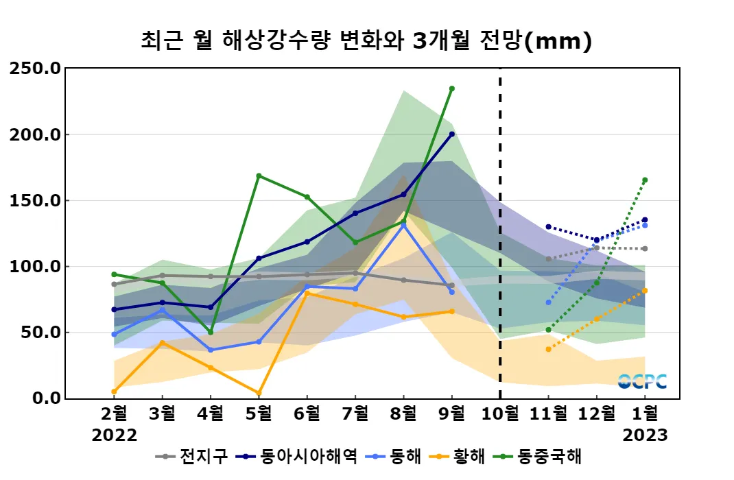 동해, 황해의 해상강수량은 평년보다 많겠으며, 동중국해는 평년과 비슷하겠습니다.