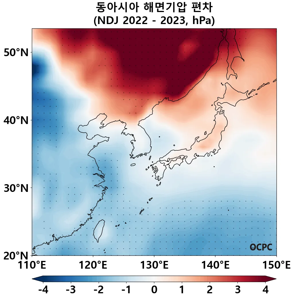 A-B. 동아시아 해면기압 편차 전망(2022년 11월~2023년 1월 평균, 점표시: 평년 표준편차 초과 해역)