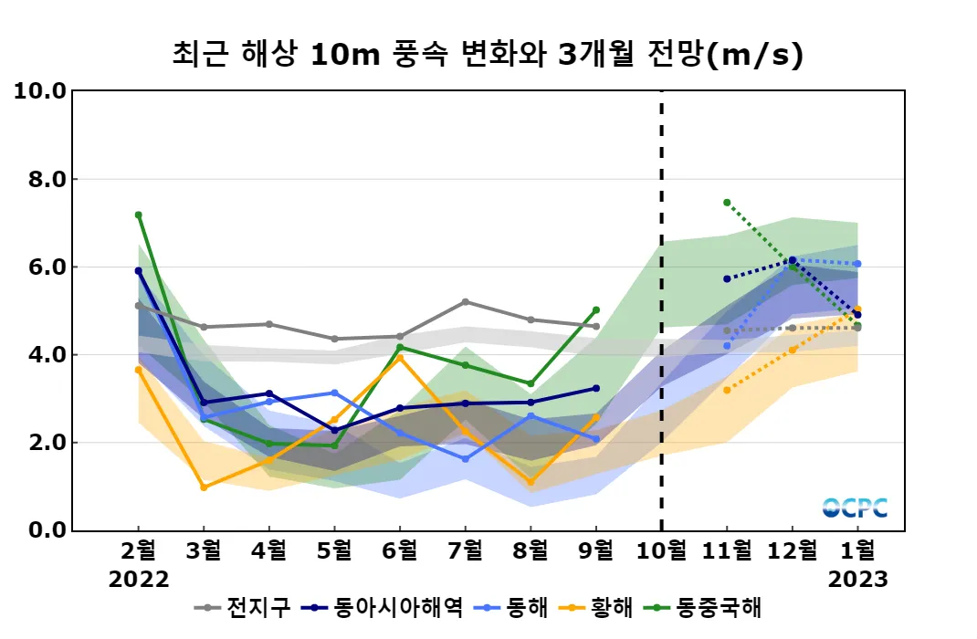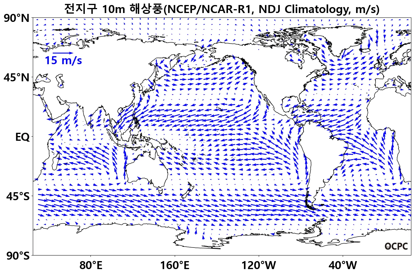 ○ (해상풍) 전지구 평균 해상풍속은 평년보다 강하겠으며, 동아시아해역, 동해, 황해, 동중국해는 평년과 비슷하겠습니다.