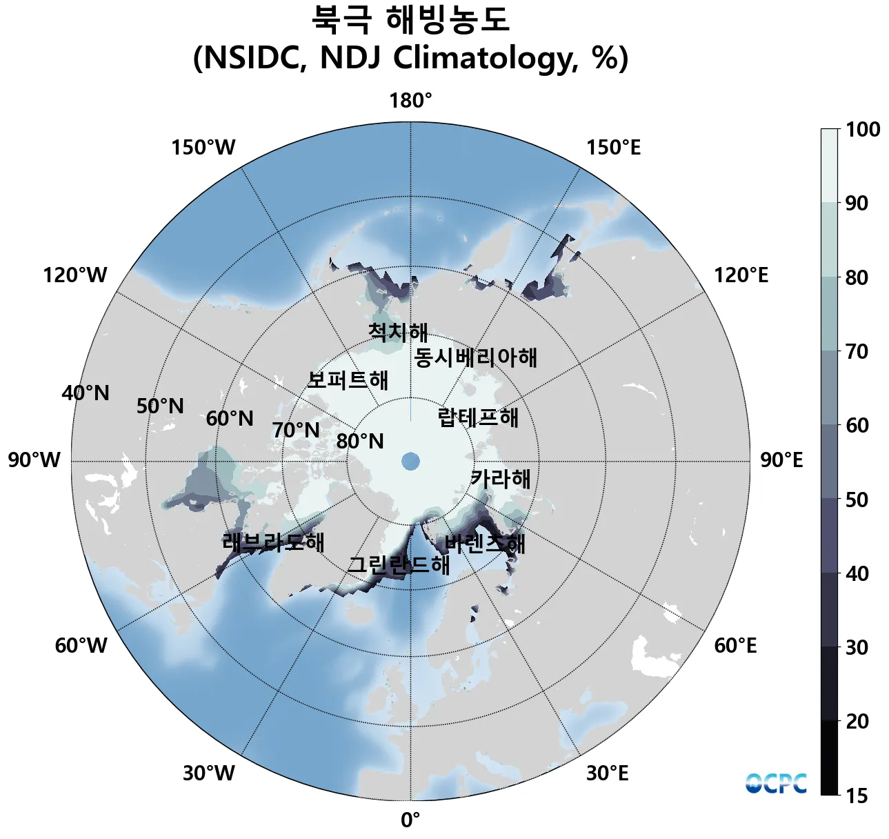 B. 북극 해빙농도(평년 11~1월 평균, 15% 이상 해역)