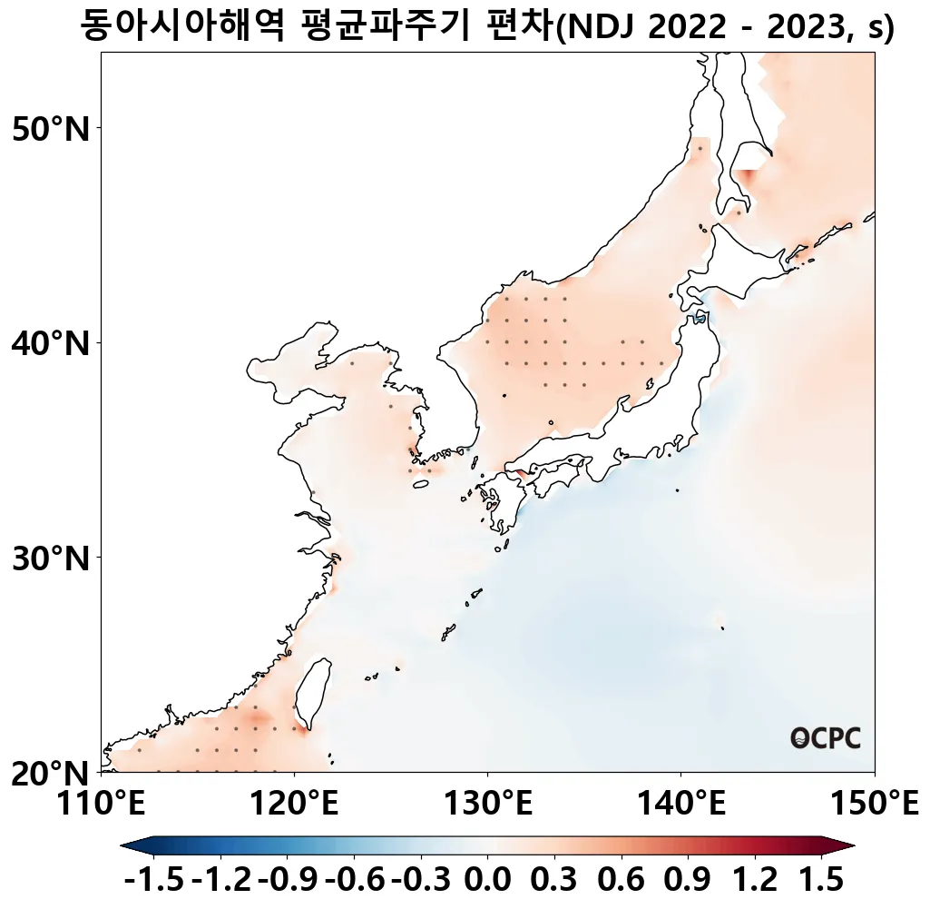 A-B. 동아시아해역 평균파주기 편차 전망(2022년 11월~2023년 1월 평균, 점표시: 평년 표준편차 초과 해역)
