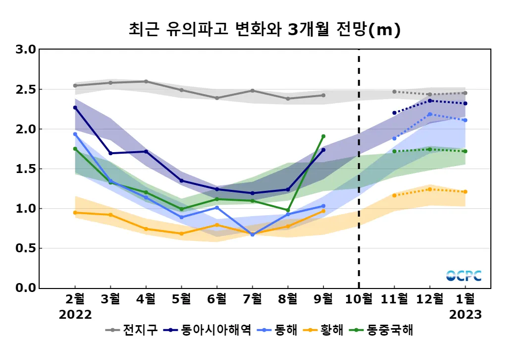 동해의 평균 유의파고는 평년보다 높고, 황해, 동중국해는 평년과 비슷할 것으로 전망됩니다.