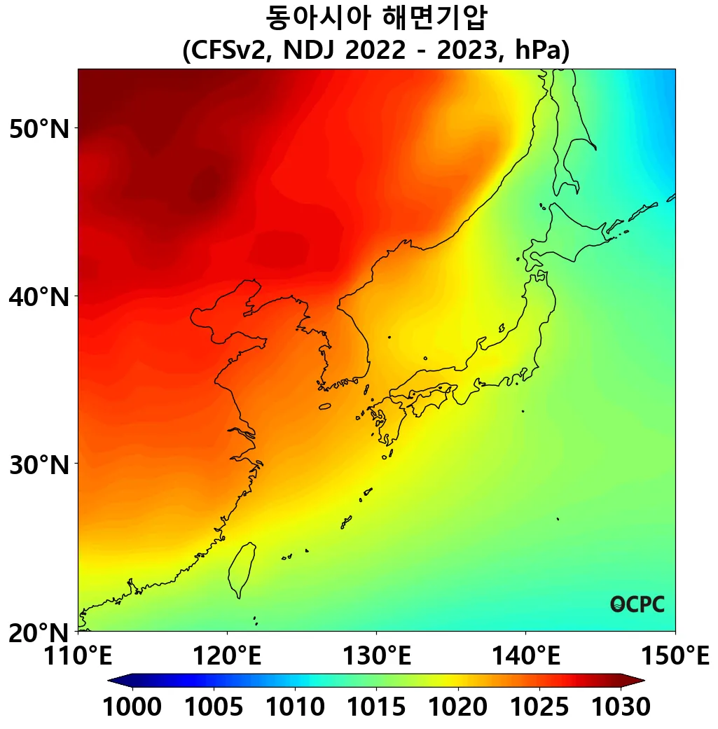 A. 동아시아 해면기압 전망(2022년 11월~2023년 1월 평균)