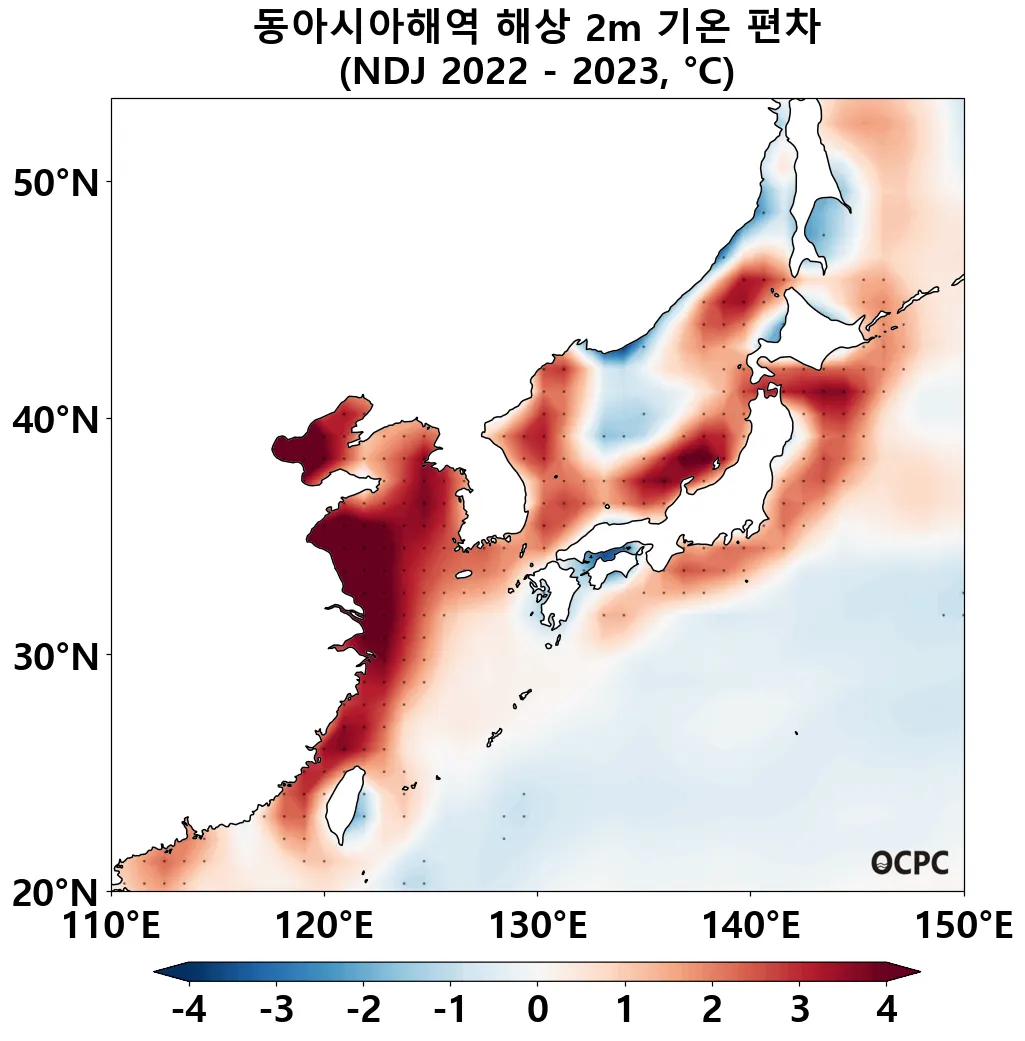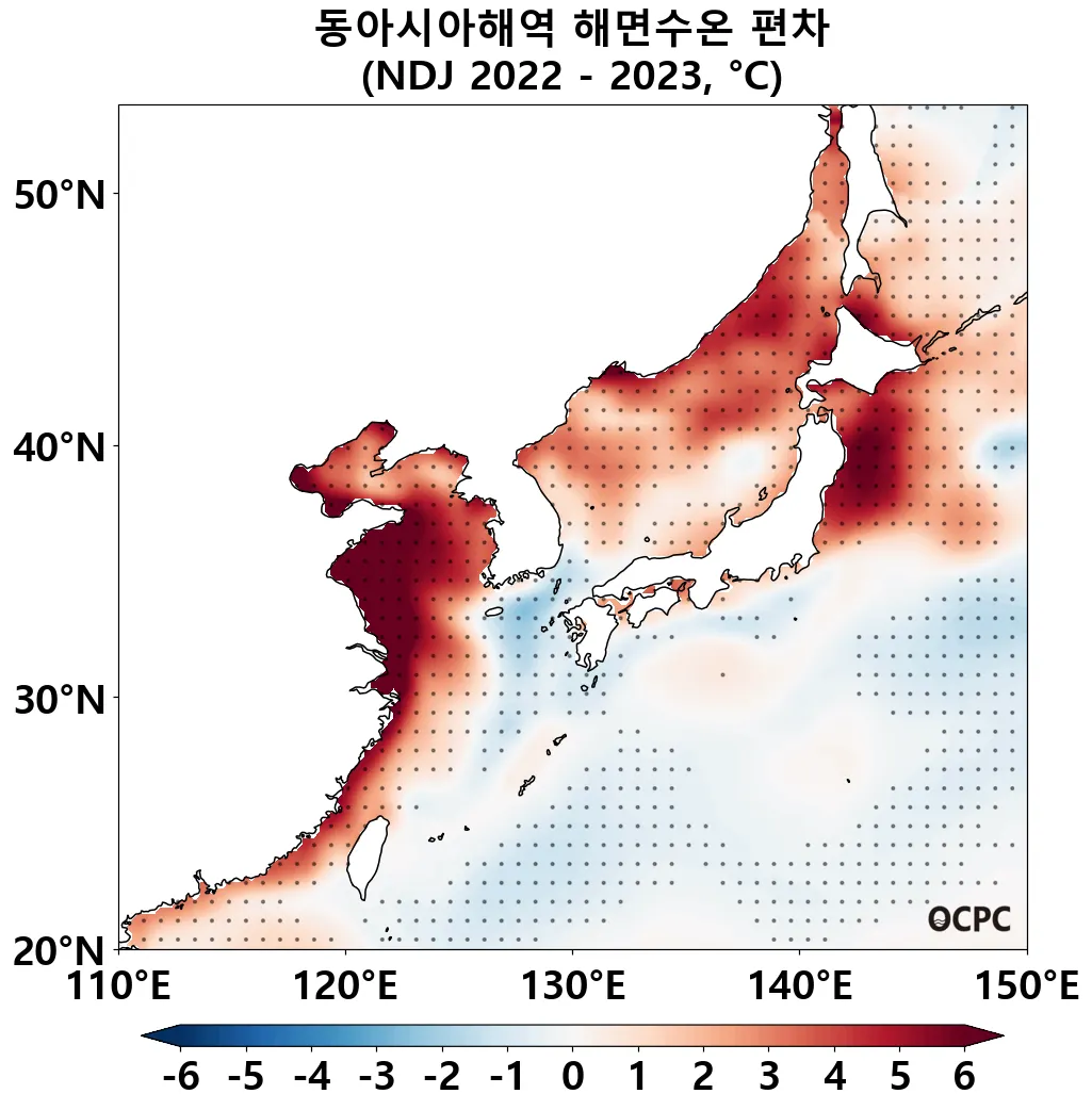 A-B. 동아시아해역 해상기온 편차 전망(2022년 11월~2023년 1월 평균, 점표시: 평년 표준편차 초과 해역)
