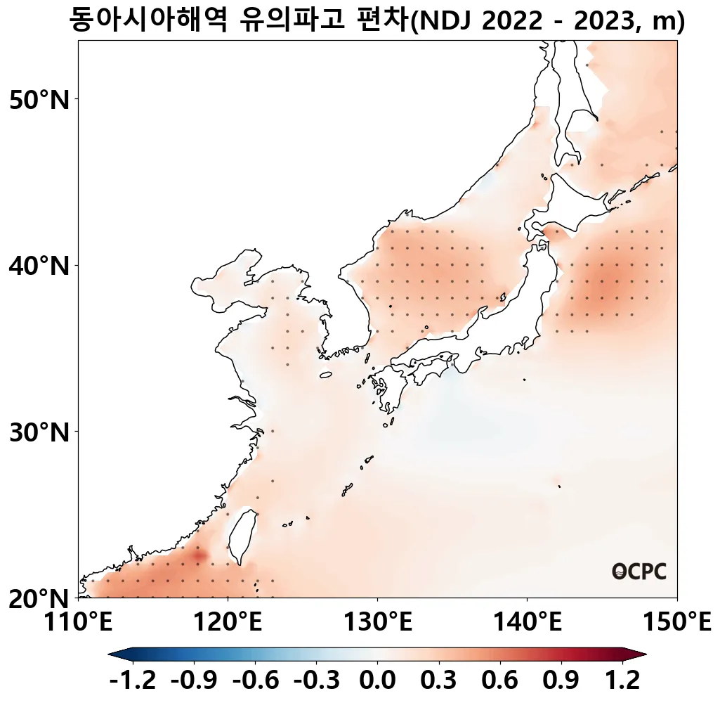 A-B. 동아시아해역 유의파고 편차 전망(2022년 11월~2023년 1월 평균, 점표시: 평년 표준편차 초과 해역)