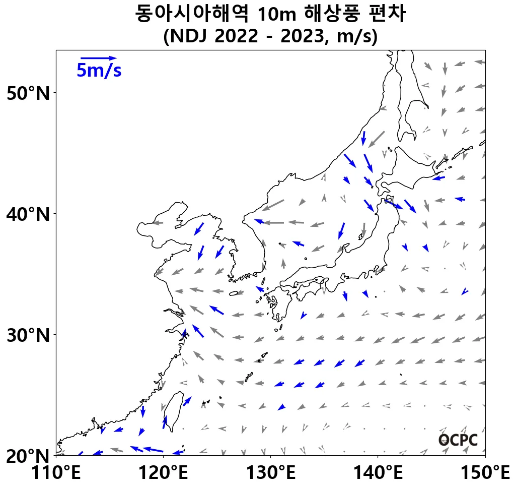A-B. 동아시아해역 해상풍 편차 전망(2022년 11월~2023년 1월 평균, 청색벡터: 평년 표준편차 초과 해역)