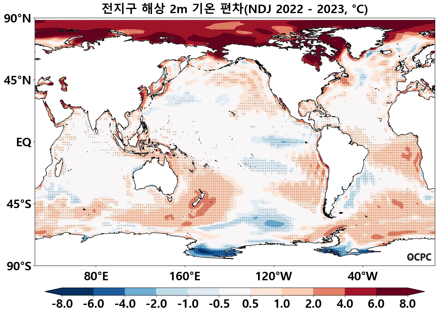 A-B. 전지구 해상기온 편차 전망(2022년 11월~2023년 1월 평균, 점표시: 평년 표준편차 초과 해역)