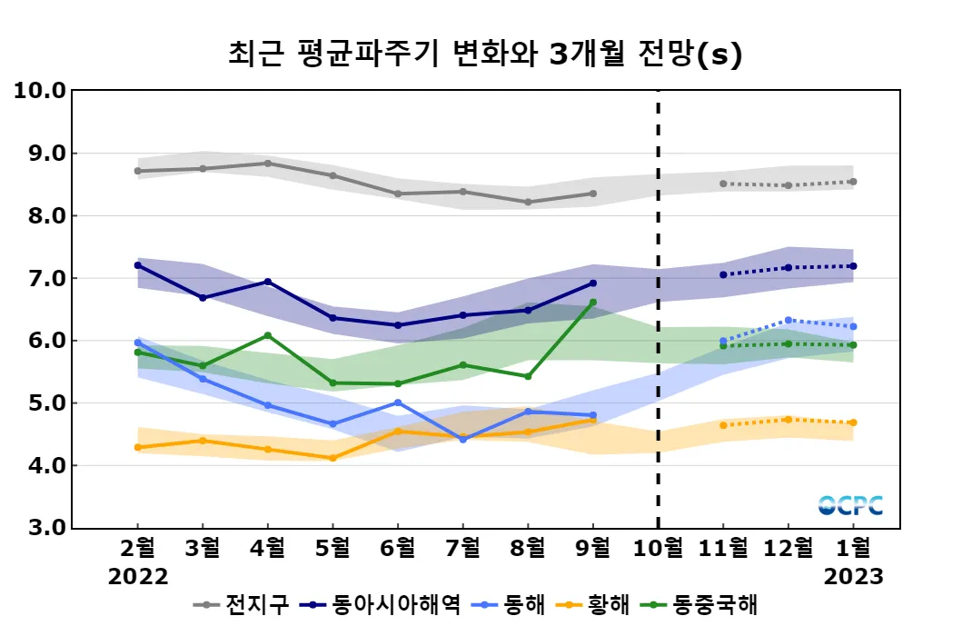 동해, 황해, 동중국해의 평균파주기는 평년과 비슷할 것으로 전망됩니다.