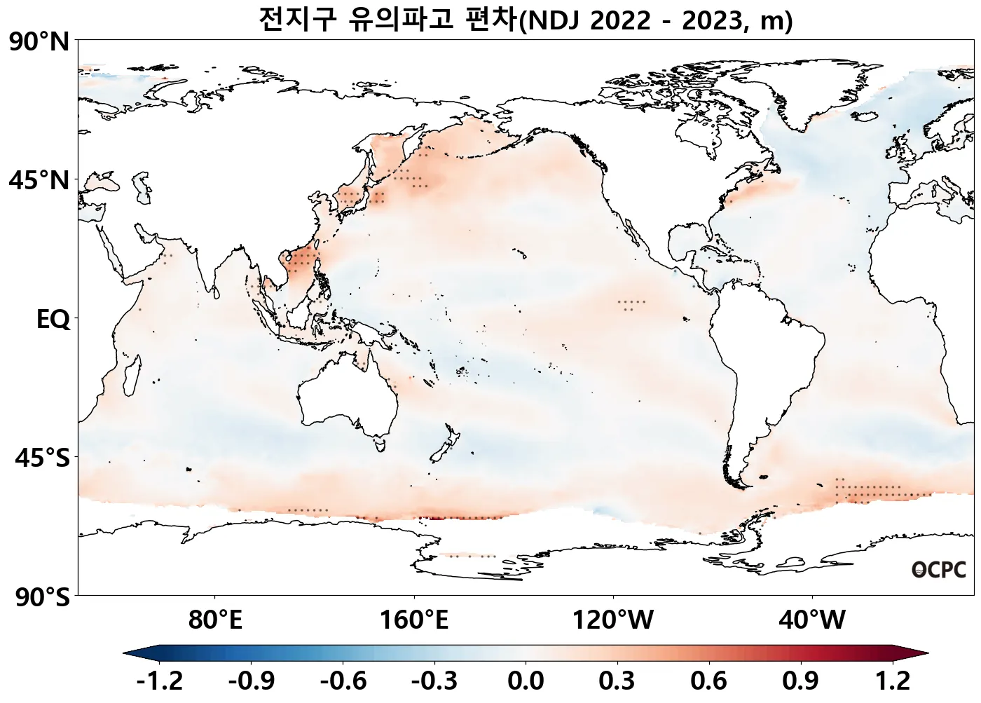 A-B. 전지구 유의파고 편차 전망(2022년 11월~2023년 1월 평균, 점표시: 평년 표준편차 초과 해역)