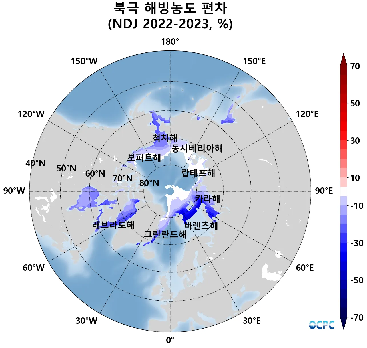 A-B. 북극 해빙농도 편차 전망(2022년 11월~2023년 1월 평균, 15% 이상 해역)