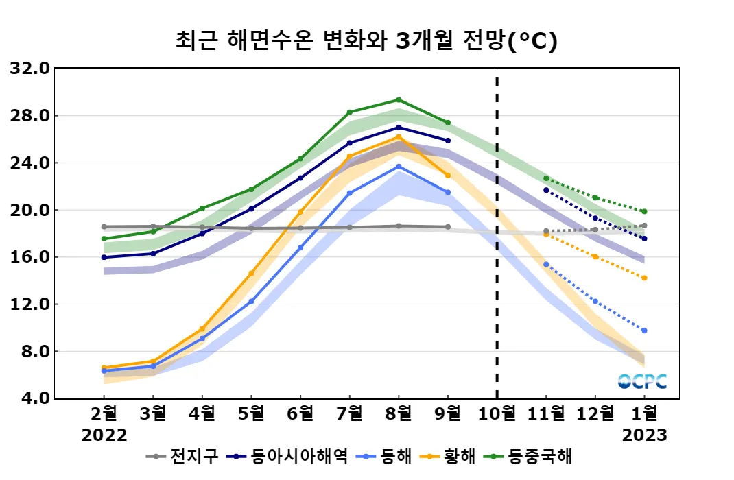 A. 동아시아해역 해면수온 전망(2022년 11월~2023년 1월 평균)