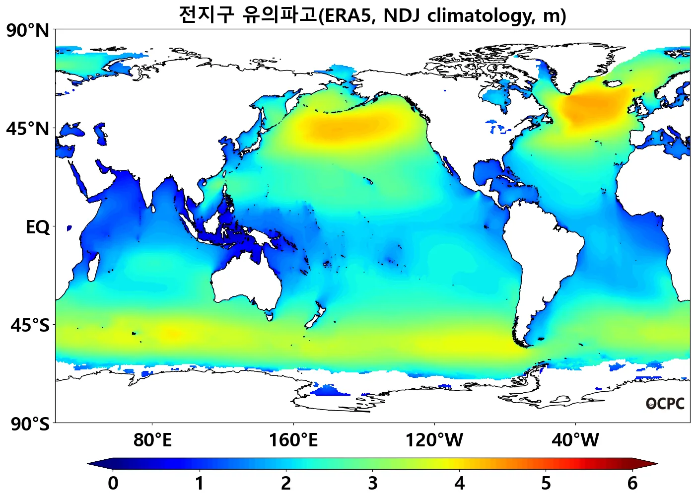 전지구 평균 유의파고는 평년과 비슷하겠습니다.