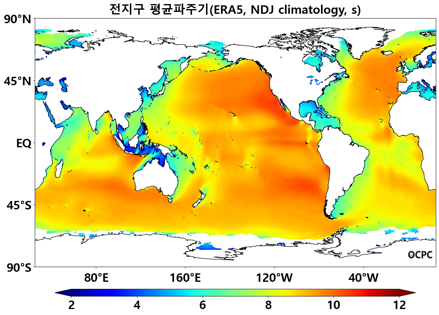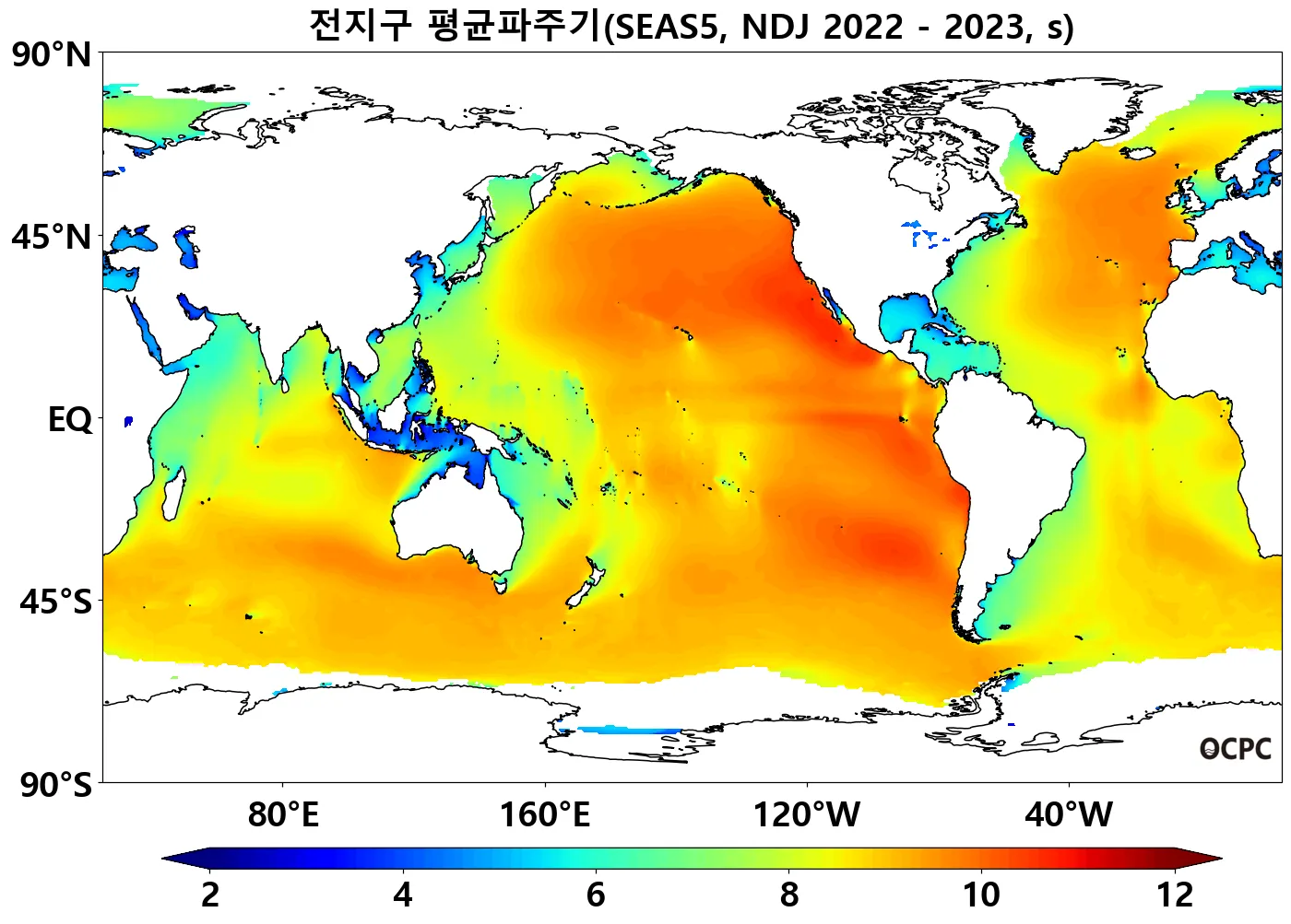○ (평균파주기) 전지구, 동아시아해역, 동해, 황해, 동중국해의 평균파주기는 평년과 비슷할 것으로 전망됩니다.