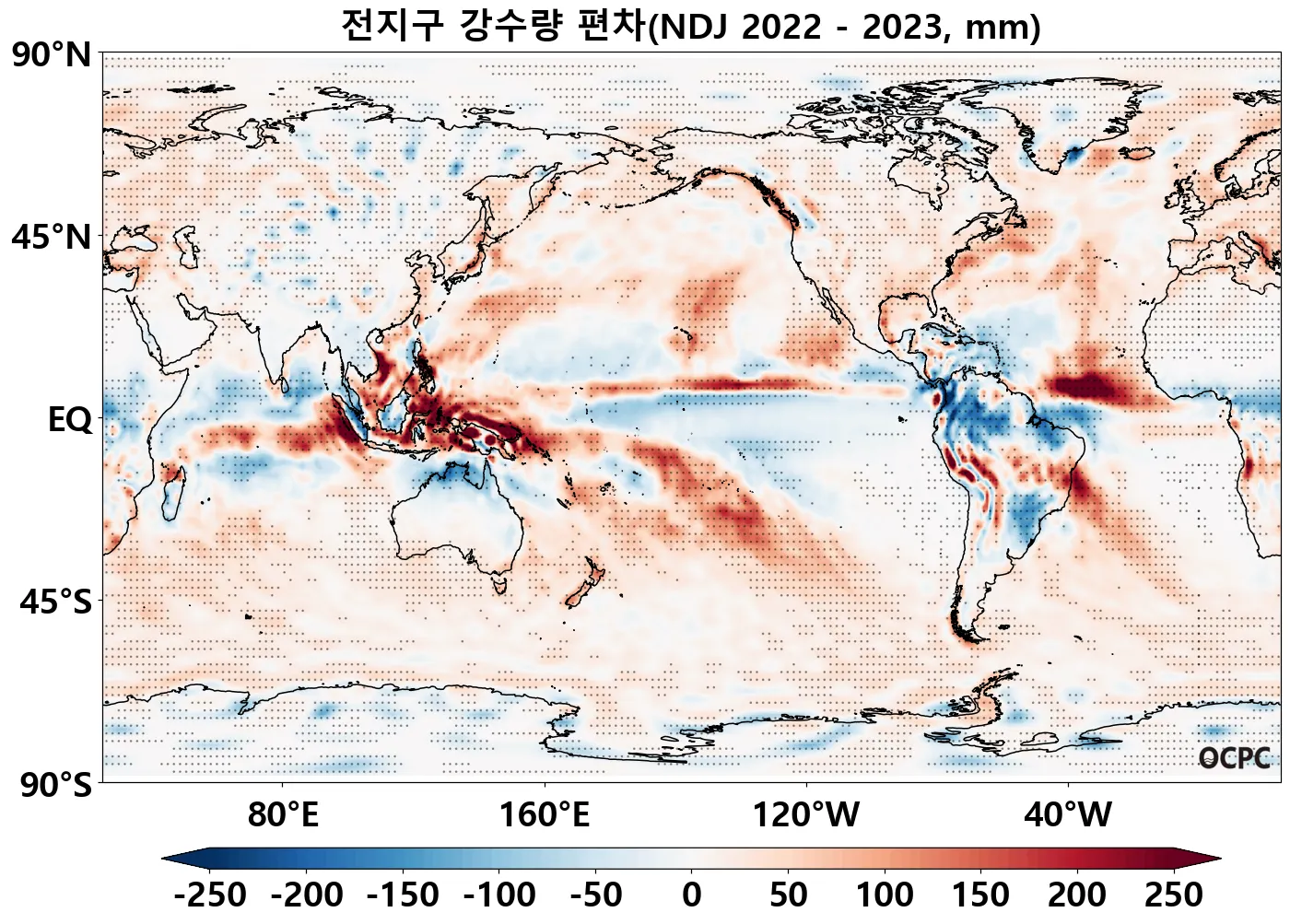 A-B. 전지구 강수량 편차 전망(2022년 11월~2023년 1월 평균, 점표시: 평년 표준편차 초과 해역)