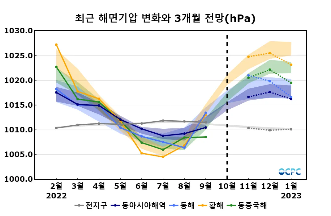 동해, 황해, 동중국해의 해면기압은 평년과 비슷하겠습니다.