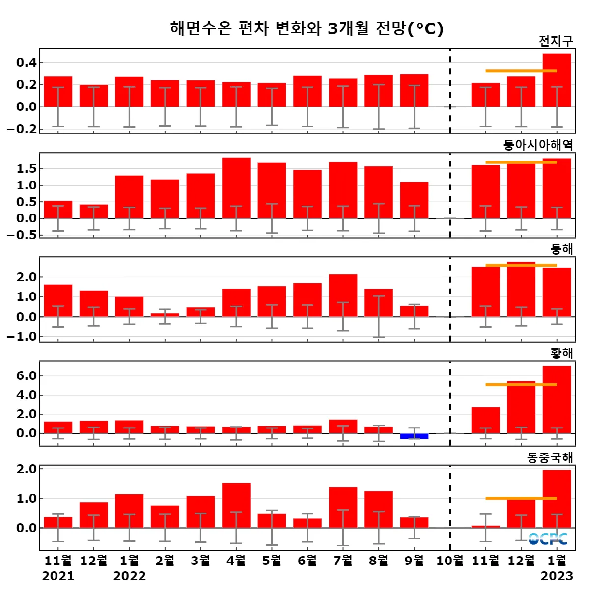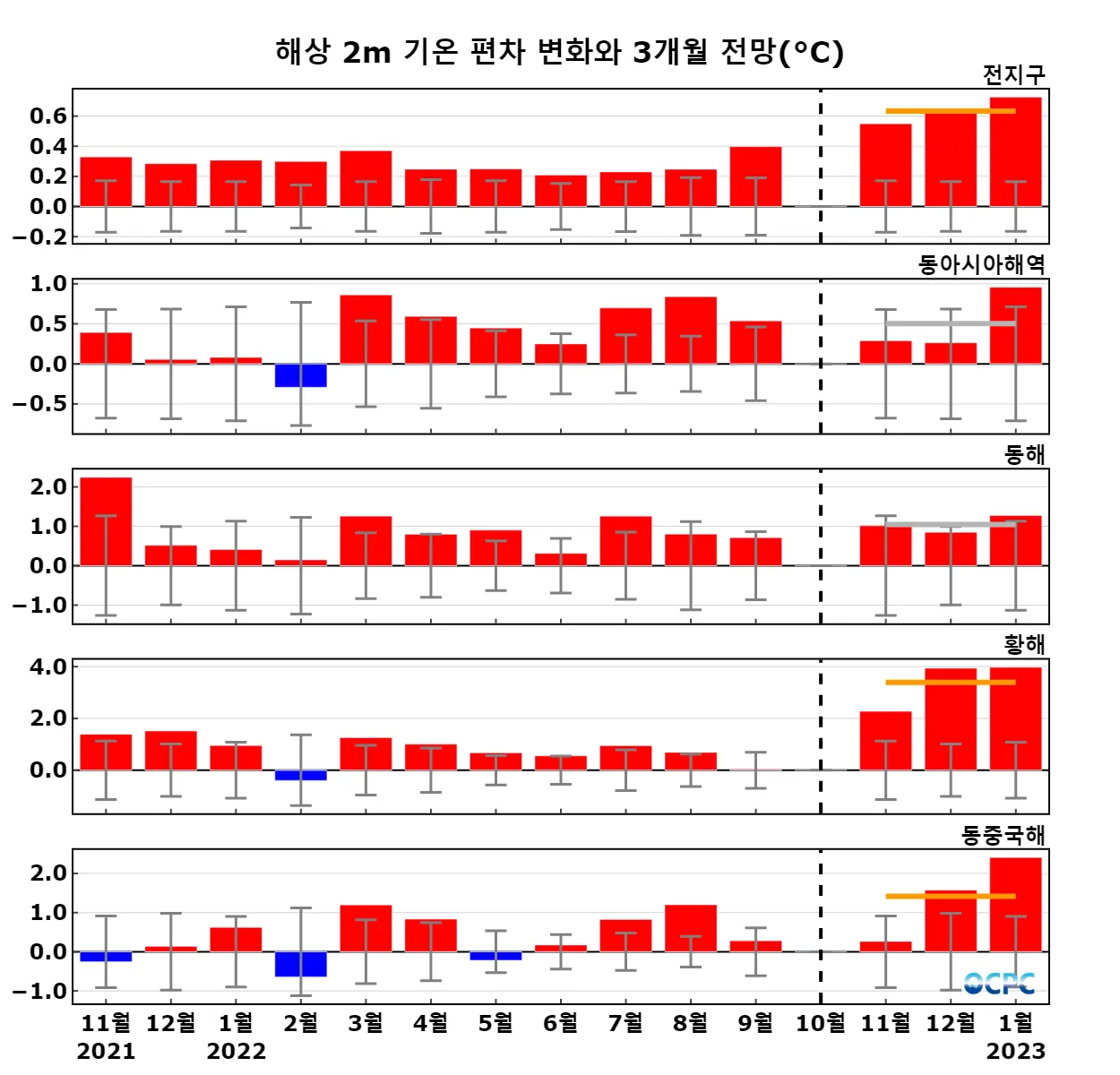 A. 전지구 해상기온 전망(2022년 11월~2023년 1월 평균)