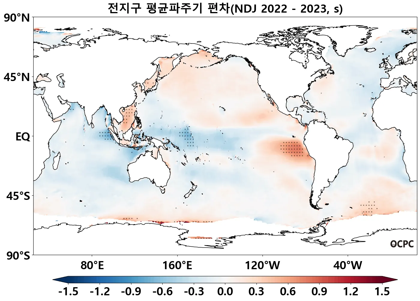 A-B. 전지구 평균파주기 편차 전망(2022년 11월~2023년 1월 평균, 점표시: 평년 표준편차 초과 해역)