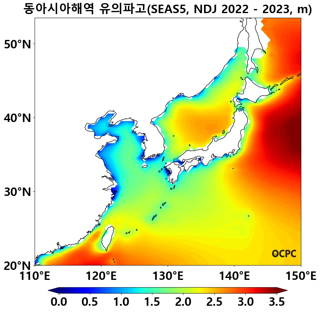 동아시아해역의 평균 유의파고는 평년보다 높을 것으로 전망됩니다.