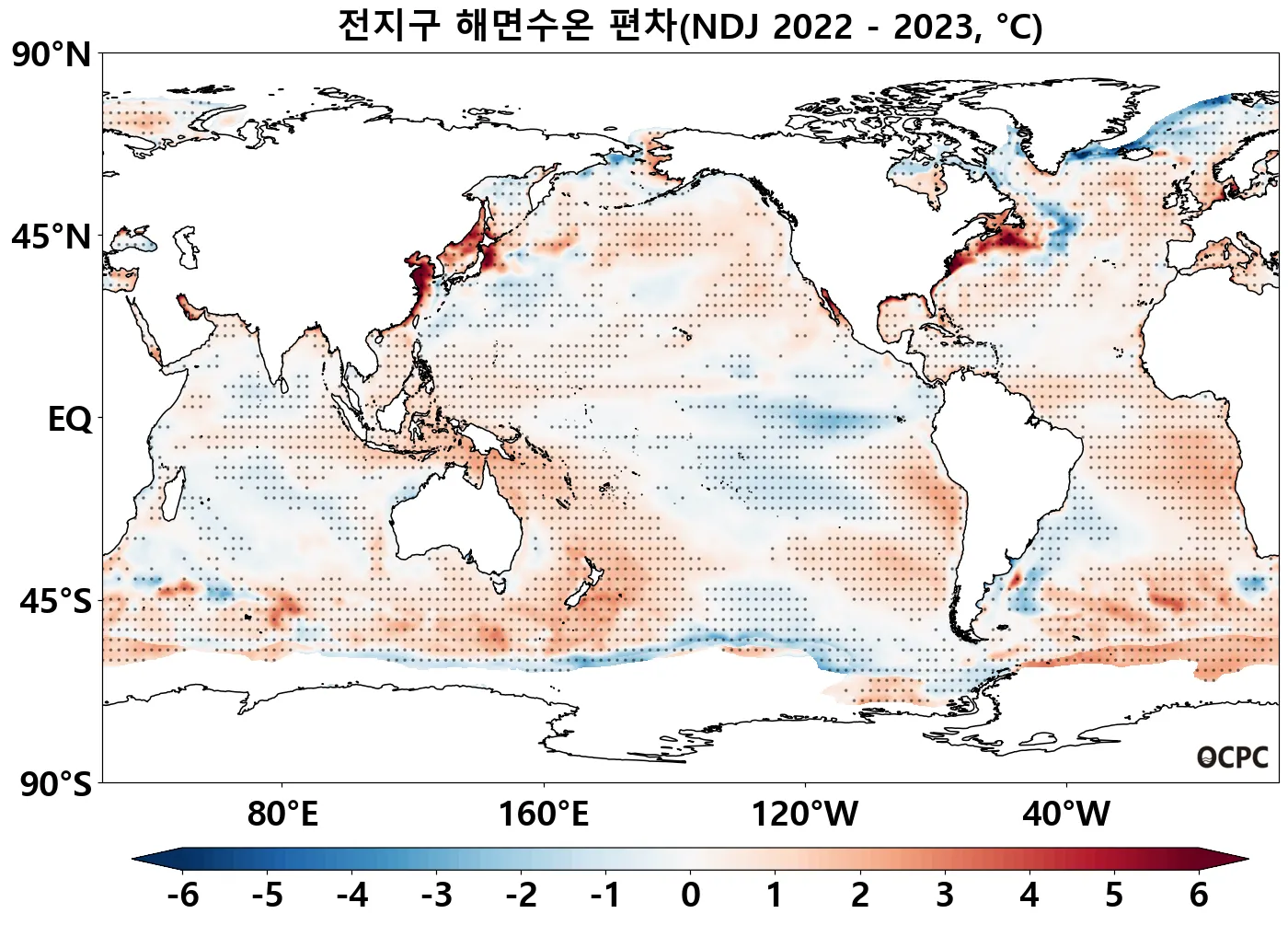 A-B. 전지구 해면수온 편차 전망(2022년 11월~2023년 1월 평균, 점표시: 평년 표준편차 초과 해역)