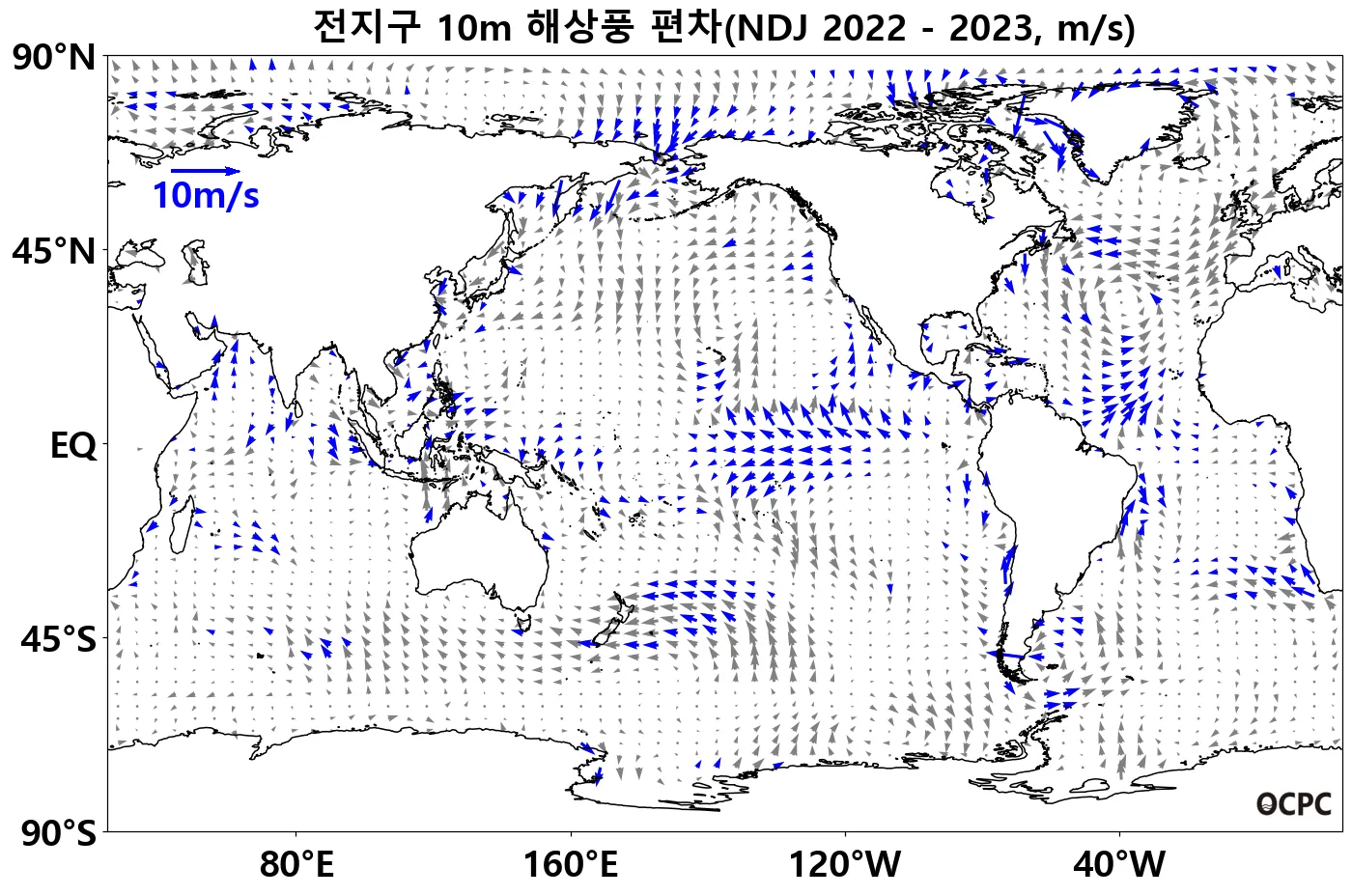 A-B. 전지구 해상풍 편차 전망(2022년 11월~2023년 1월 평균, 청색벡터: 평년 표준편차 초과 해역)