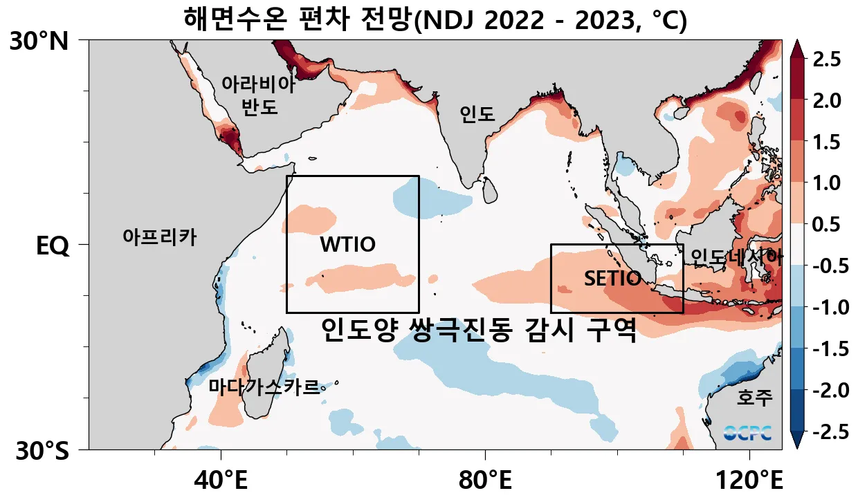2022년 11월 ~ 2023년 1월(NDJ) 열대 남동인도양 해역(SETIO)의 해면수온은 평년에 비해 높고 열대 서인도양 해역(WTIO)의 해면수온은 평년과 유사하여 인도양 쌍극진동 지수는 음의 상태일 것으로 전망됩니다.
