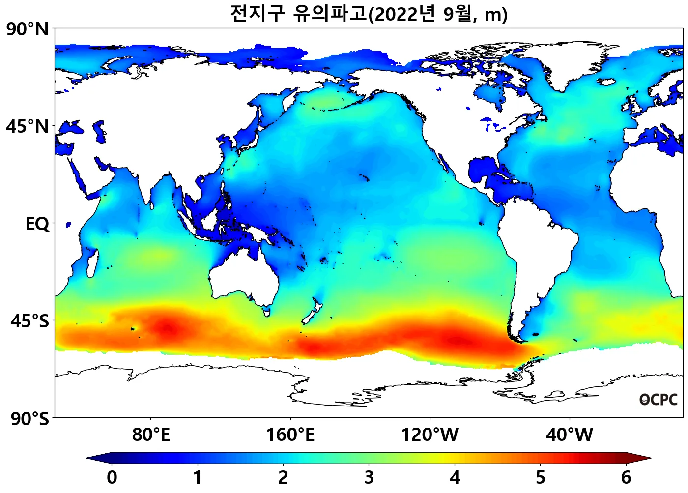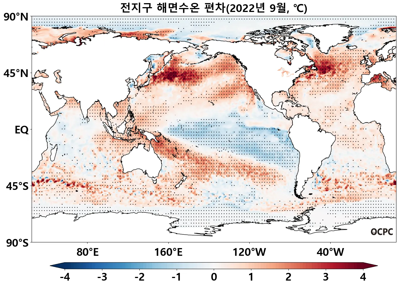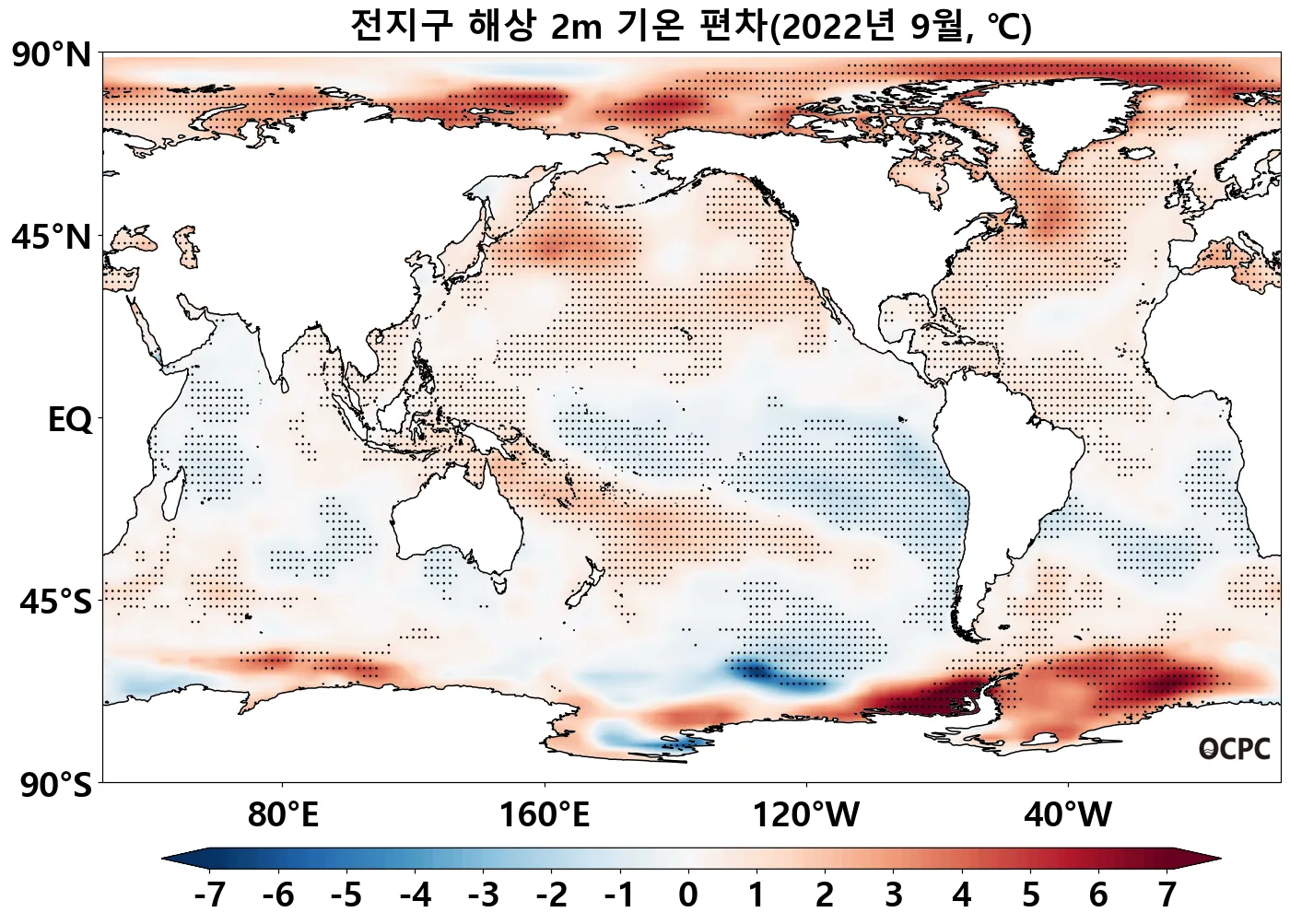 특히 북태평양과 북대서양 중위도 해역의 해면수온이 높았으며, 열대 태평양(0~30°S)은 낮았습니다.