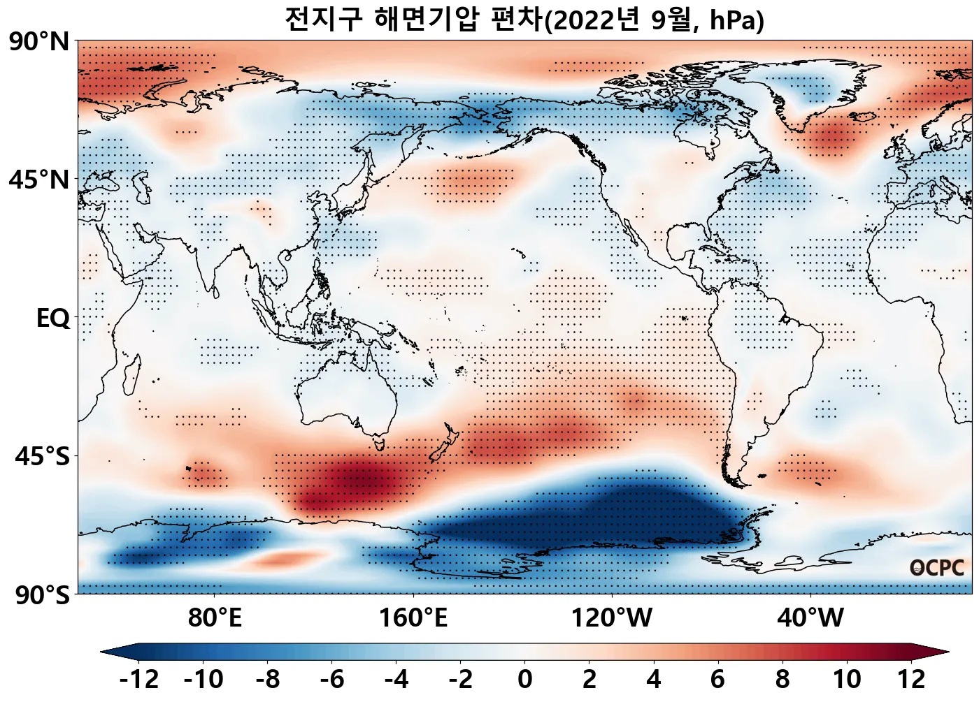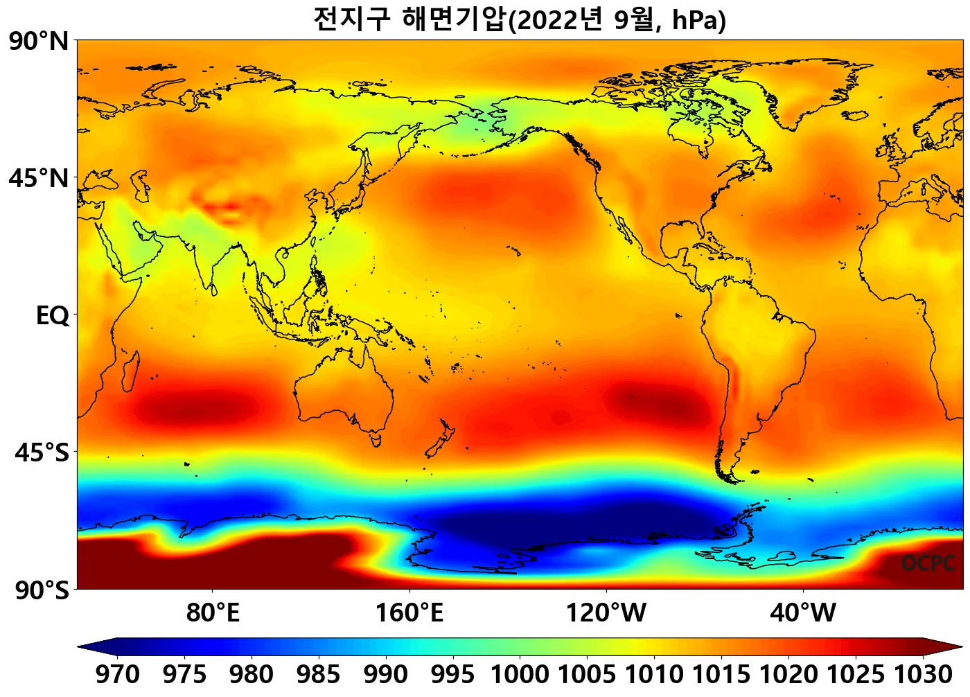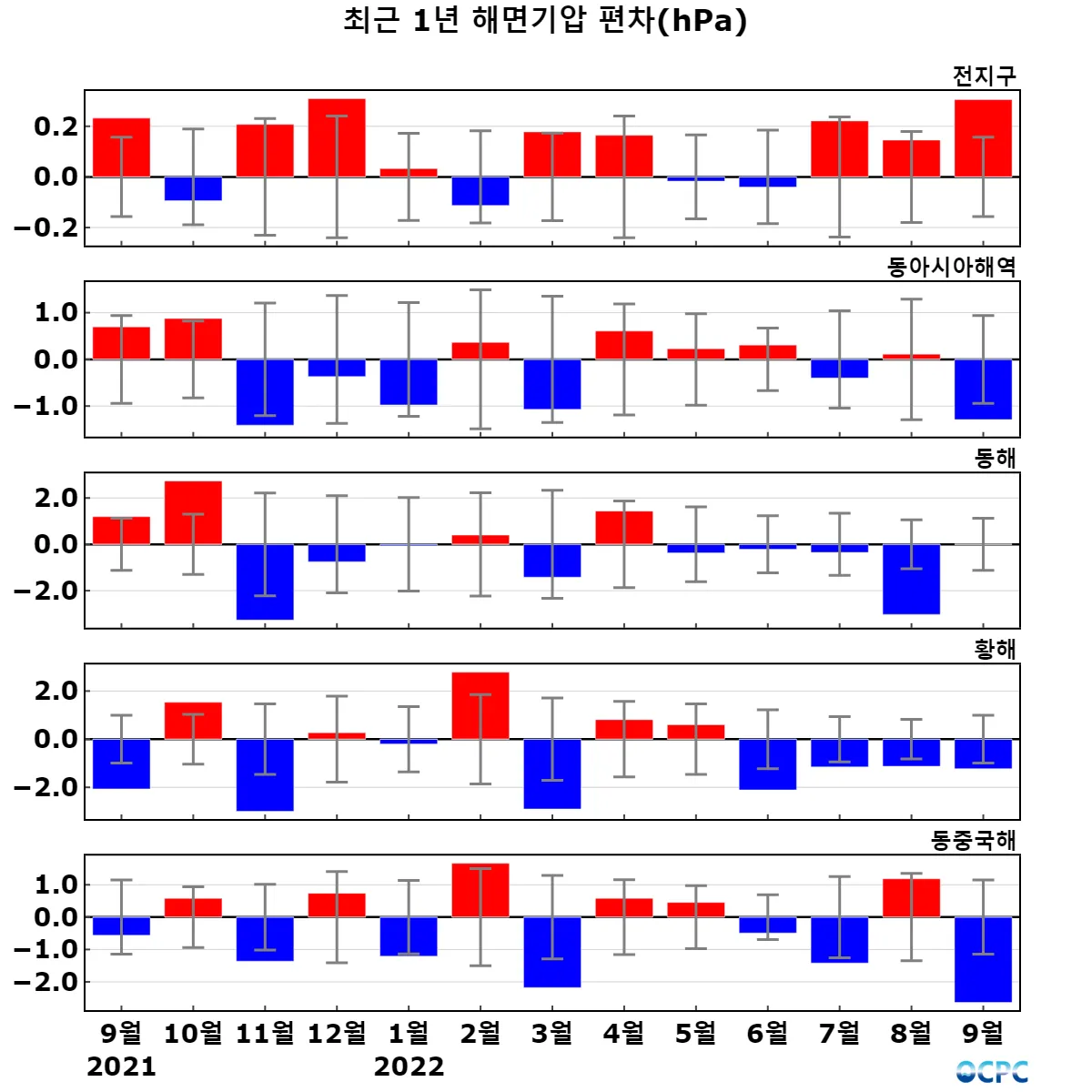 [해면기압] 전지구 평균 해면기압은 평년보다 0.3hPa 높았으며, 동아시아해역, 황해, 동중국해는 평년보다 1.2~2.6hPa 낮았습니다. 동해는 평년과 비슷했습니다. 동중국해는 1981~2022년(9월) 중 가장 낮았습니다.