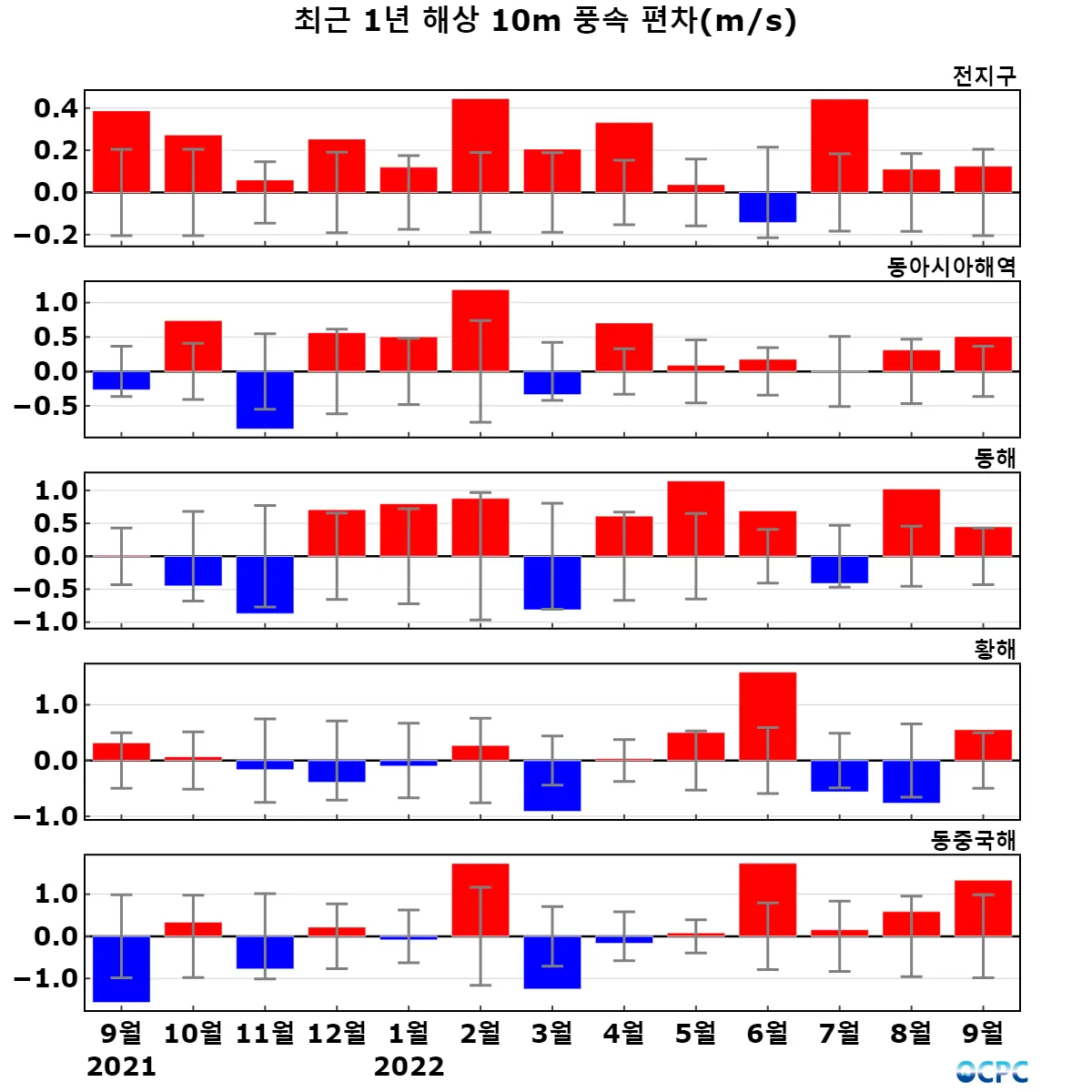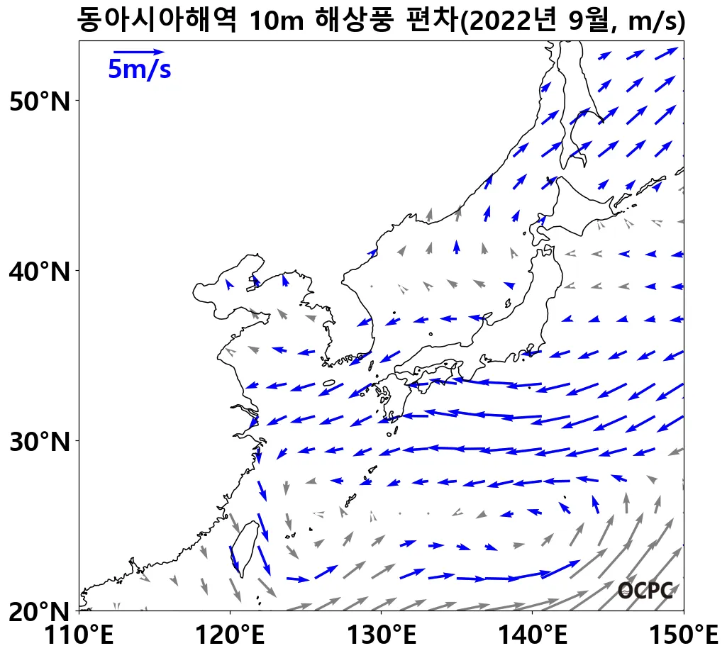 동해, 황해, 동중국해의 해상풍속은 평년(1.6m/s, 2.0m/s, 3.7m/s)보다 0.4m/s(26.8%), 0.6m/s(27.2%), 1.3m/s(36.0%) 강했습니다.