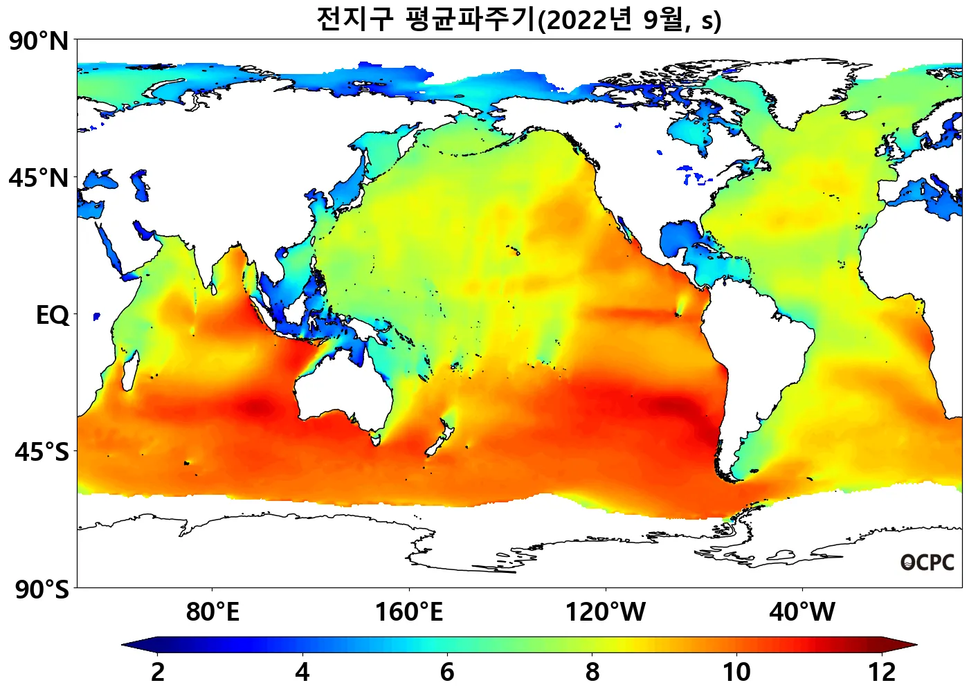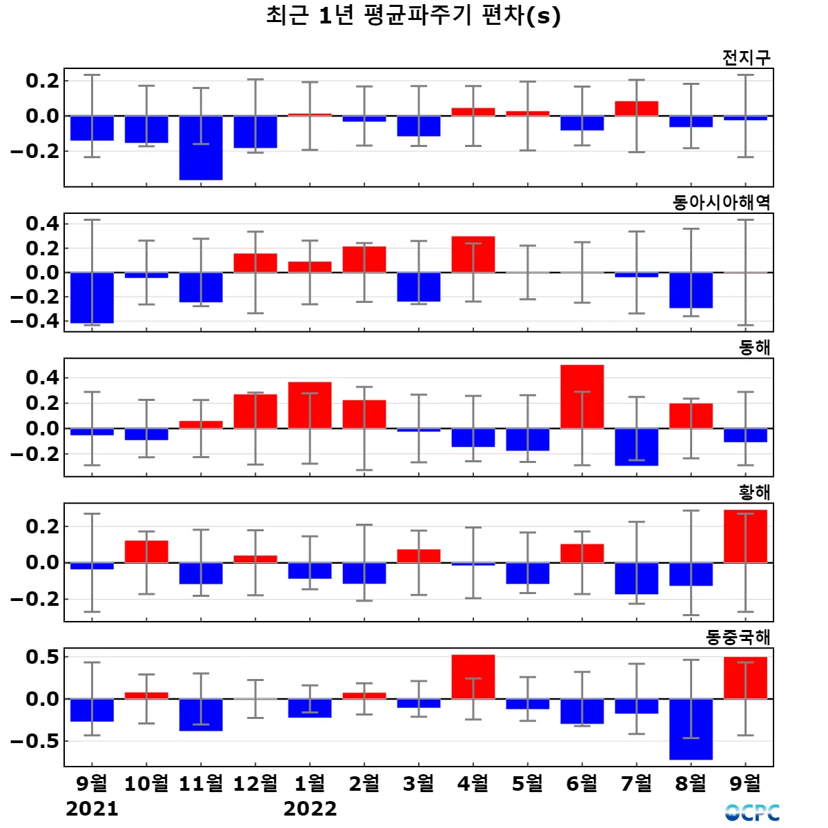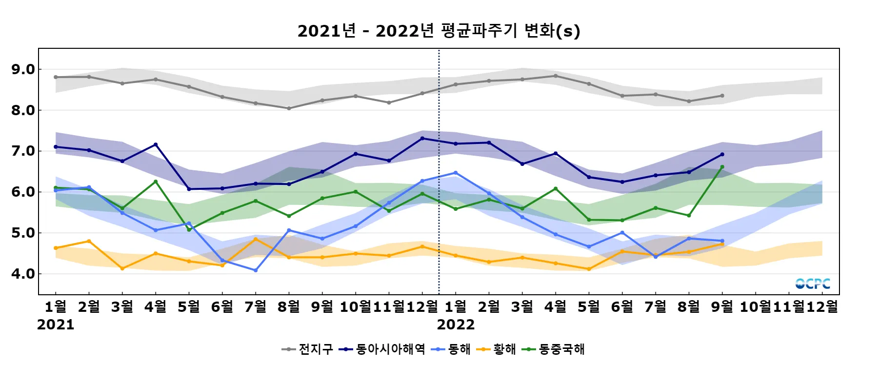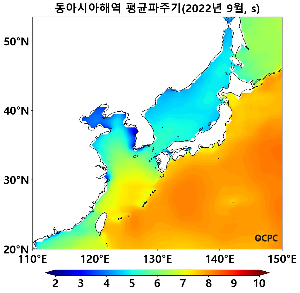황해, 동중국해의 평균파주기는 평년(4.4초, 6.1초)보다 각각 0.3초, 0.5초씩 증가했고, 동해는 평년(4.9초)과 비슷했습니다.