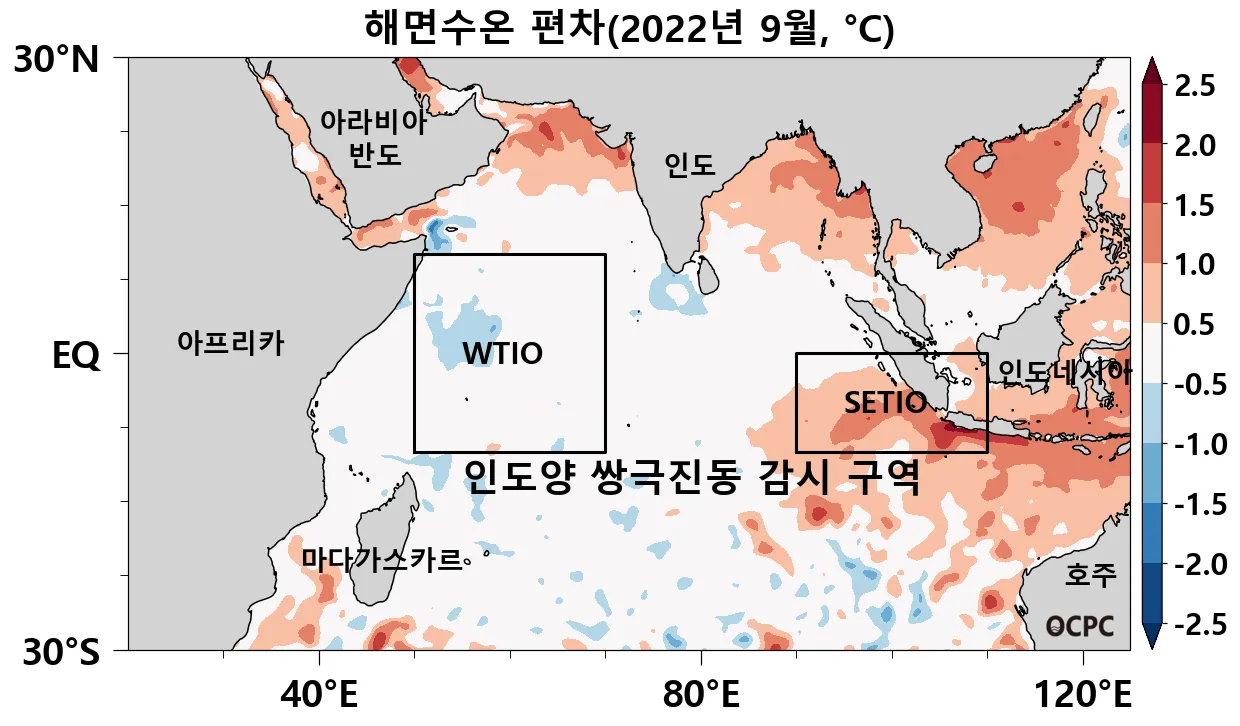 2022년 9월 평균 해면수온의 평년 대비 편차 (사각형은 인도양 쌍극진동 감시구역으로 각각 WTIO(열대서인도양), SETIO(열대 남동인도양) 해역이며, 인도양 쌍극진동 지수(DMI: Dipole Mode Index)는 WTIO의 평년 대비 편차에서 SETIO의 평년 대비 편차를 뺀 값입니다.)