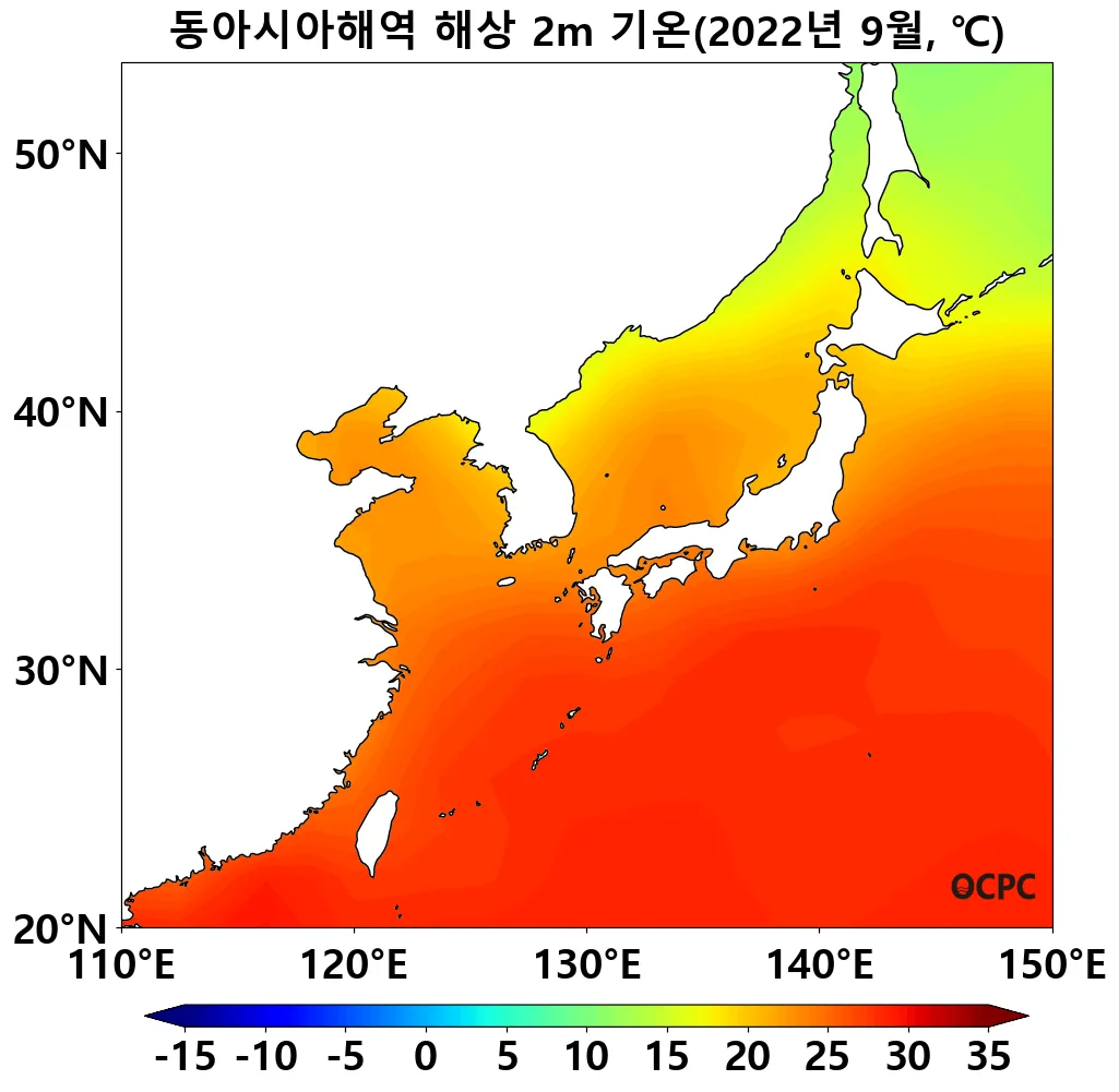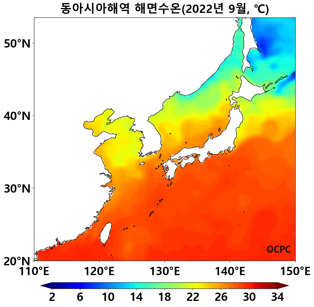 1992~2022년 동안 전지구 9월 해면수온은 10년에 0.2°C씩 증가하는 추세이며, 동아시아해역의 추세는 10년에 0.1~0.3°C로 그 중 동해의 상승률이 가장 큽니다.